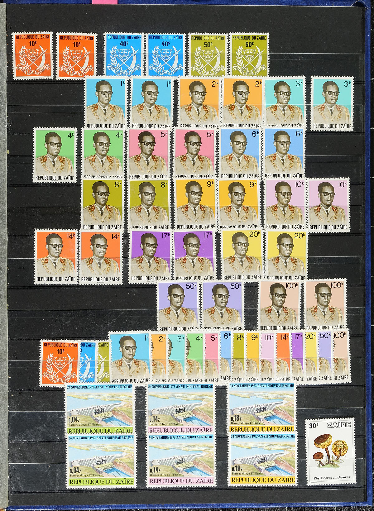 Collection / accumulation of primarily mint never hinged Congo Democratic Republic, 1960's-1971, containing many hundreds of stamps, primarily sets, housed in a stockbook. The collection appears to be fairly complete in period, including a few souvenir sheets (including a few imperforates), along with a selection of Zaire and Belgian Congo issues. A spot check indicated a few sets and souvenir sheets cataloguing in the $5 to $15 and up range. A nice colorful lot for topical and thematic collectors. Estimate =