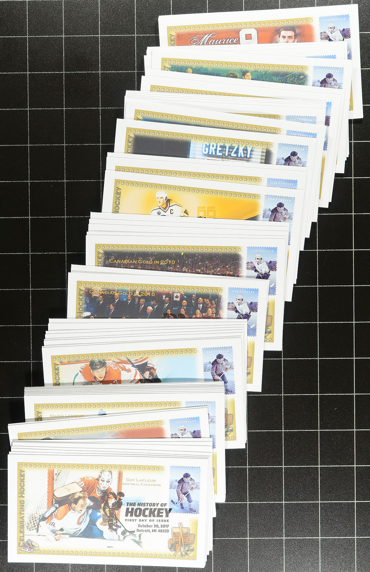 Very interesting lot of 53 USA first day covers "The History of Hockey", from 2017, franked with either Scott #5252-5253, with homemade (laser printed) cachets celebrating NHL superstars from the past and present, with a few having more than one different cachet. Just a few of the names include Gordie Howe, Wayne Gretzky, Bobby and Brett Hull, Guy Lafluer, and more, including a few celebrating gold medal winning teams. Each cover receives a 5 line cancel "The History of Hockey, First day of issue, October 20, 2017, Detroit MI 48233". A great lot for the first day cover collector, topical and thematic collectors. These originally retailed for US$460.00! Estimate =