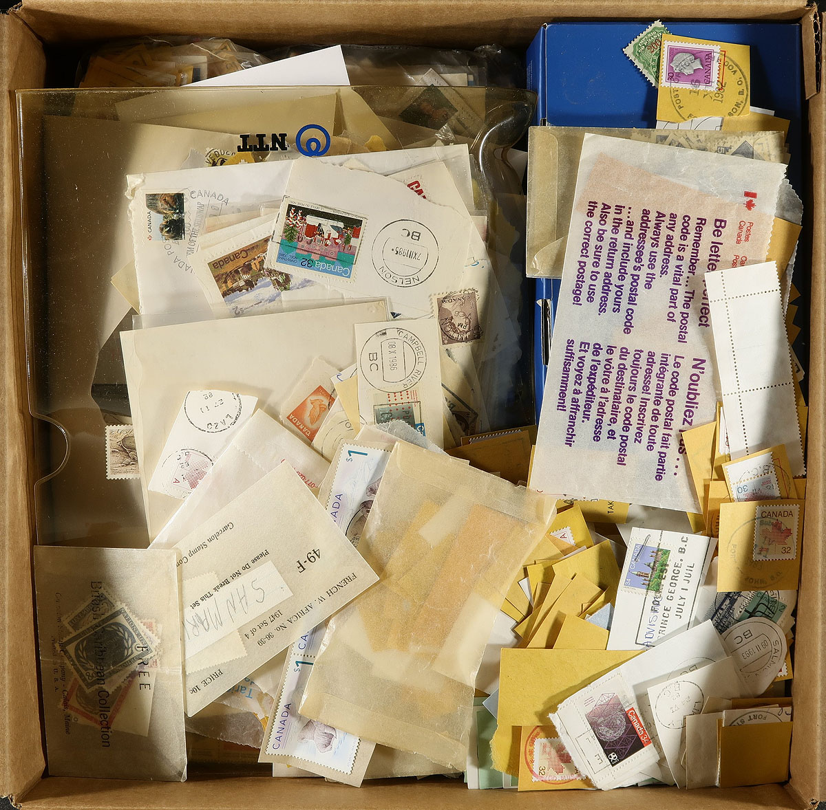 Accumulation of several hundreds (probably over 1,000) Canada postmarks, with stamps mostly on paper, generally ranging from the 1970's to the 1990's. A spot check indicated mostly town postmarks from western provinces (namely Alberta and British Columbia), noting cds, POCON types, Klussendorf, and likely more. A nice lot for the town postmark collector. Estimate =