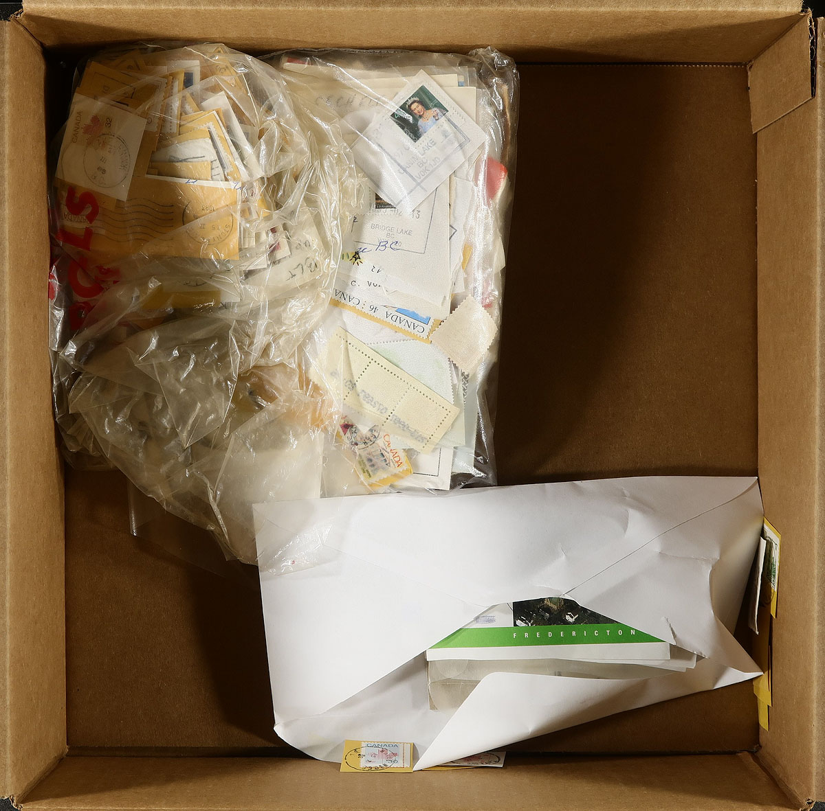 Accumulation of several hundreds (probably over 1,000) Canada postmarks, with stamps mostly on paper, generally ranging from the 1970's to the 1990's. A spot check indicated mostly town postmarks from western provinces (namely Alberta and British Columbia), noting cds, POCON types, Klussendorf, and likely more. A nice lot for the town postmark collector. Estimate =