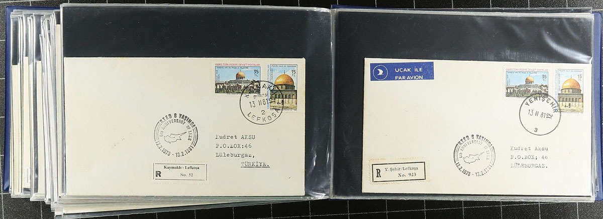 Interesting group of roughly 200 Turkish Republic of Northern Cyprus, 1970's-1990's, roughly half in a cover album, with the rest loose in a box. A spot check indicated mostly first day covers, along with some commercial mail, with single and sets frankings (few meters as well), along with cds, double circle, pictorial, and other town postmark types. Duplication appears to be small, and did note a few Cyprus covers within. A nice lot that is not usually offered in this quantity. Estimate =