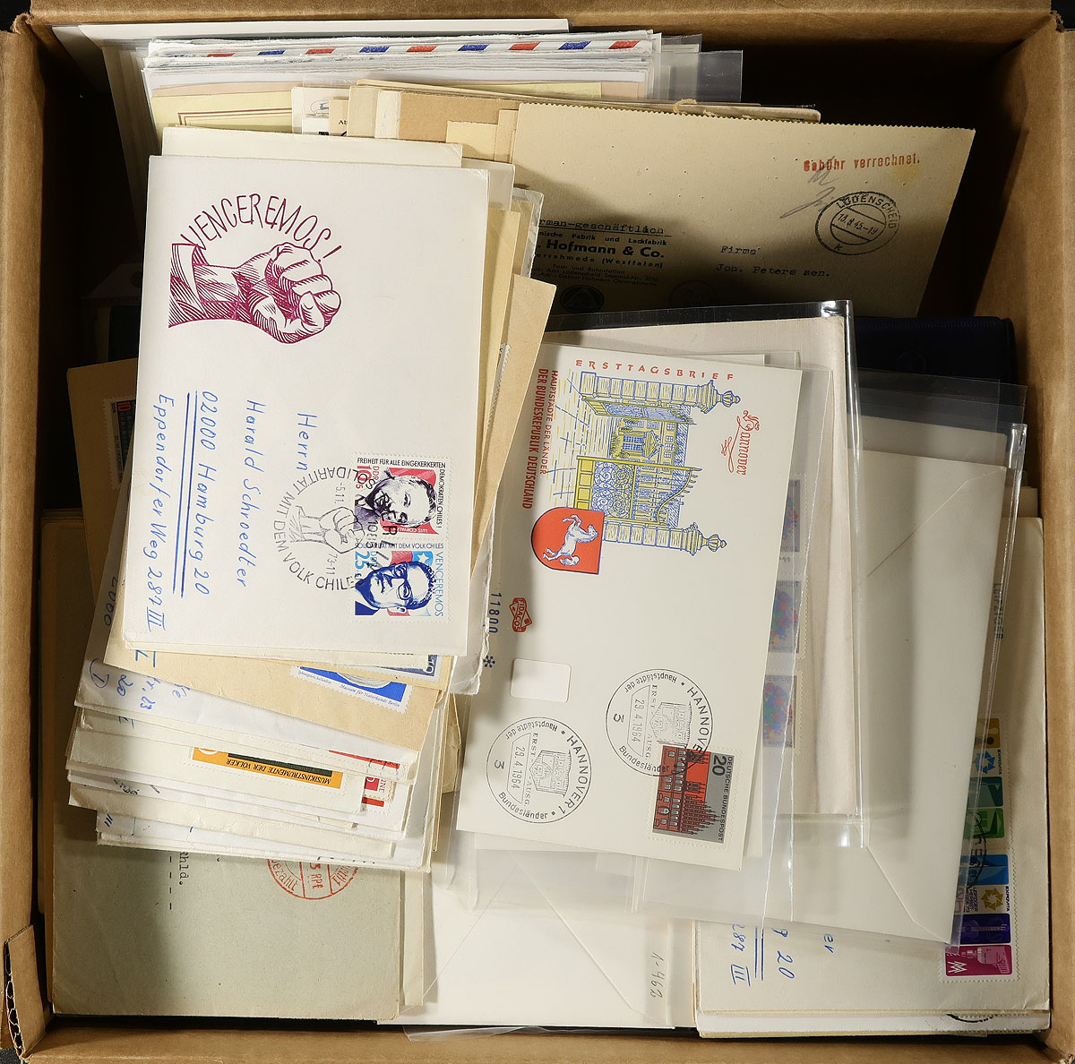 Attractive group of roughly 300 Germany covers, in 2 cover albums and loose material. The lot includes a good variety material, generally ranging from the 1920's to the 2010's, but did spot a few early covers, including a few German States, inflation period, German occupations, 3rd Reich slogan meter mail, along with first day covers, commercial mail, etc., including covers from Berlin and DDR. Postmark material includes bridge, pictorial, slogan and other town cancel types. A nice lot, with several colourful cachets, good for Germany, topical and thematic collectors. A few faults on a few covers, overall fine to very fine. Estimate =