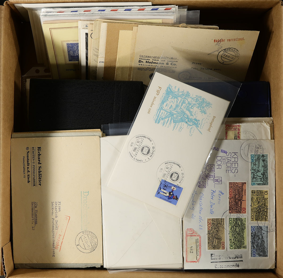 Attractive group of roughly 300 Germany covers, in 2 cover albums and loose material. The lot includes a good variety material, generally ranging from the 1920's to the 2010's, but did spot a few early covers, including a few German States, inflation period, German occupations, 3rd Reich slogan meter mail, along with first day covers, commercial mail, etc., including covers from Berlin and DDR. Postmark material includes bridge, pictorial, slogan and other town cancel types. A nice lot, with several colourful cachets, good for Germany, topical and thematic collectors. A few faults on a few covers, overall fine to very fine. Estimate =