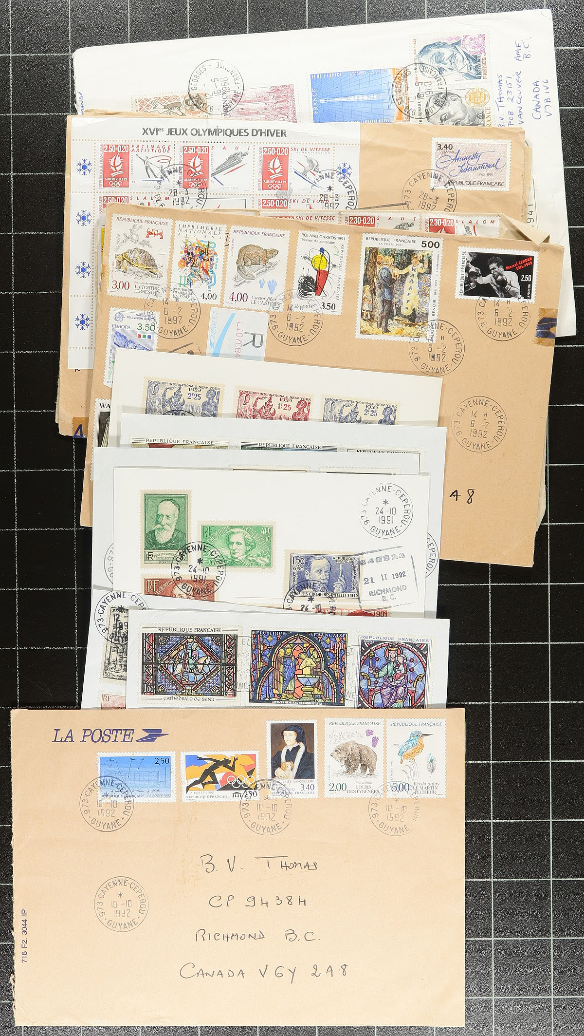 Interesting group of roughly 200 France and French colony covers, containing roughly 130 "souvenir covers" as the majority have singles and sets from the 1940's with 2006 postmarks from Guyane, along with a few commercial covers and first day covers from the Congo, Democratic Republic. A nice lot for cover collector. Estimate =