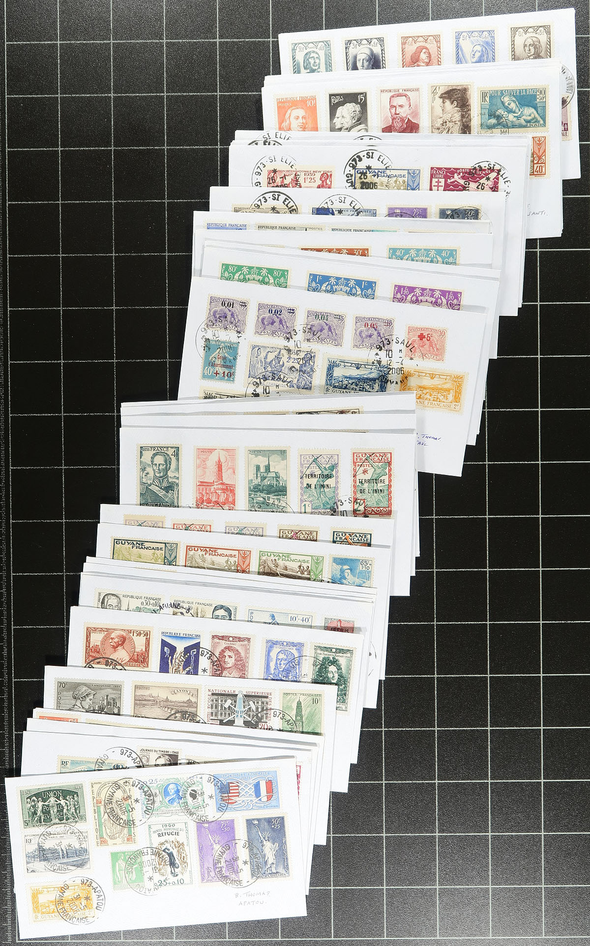Interesting group of roughly 200 France and French colony covers, containing roughly 130 "souvenir covers" as the majority have singles and sets from the 1940's with 2006 postmarks from Guyane, along with a few commercial covers and first day covers from the Congo, Democratic Republic. A nice lot for cover collector. Estimate =