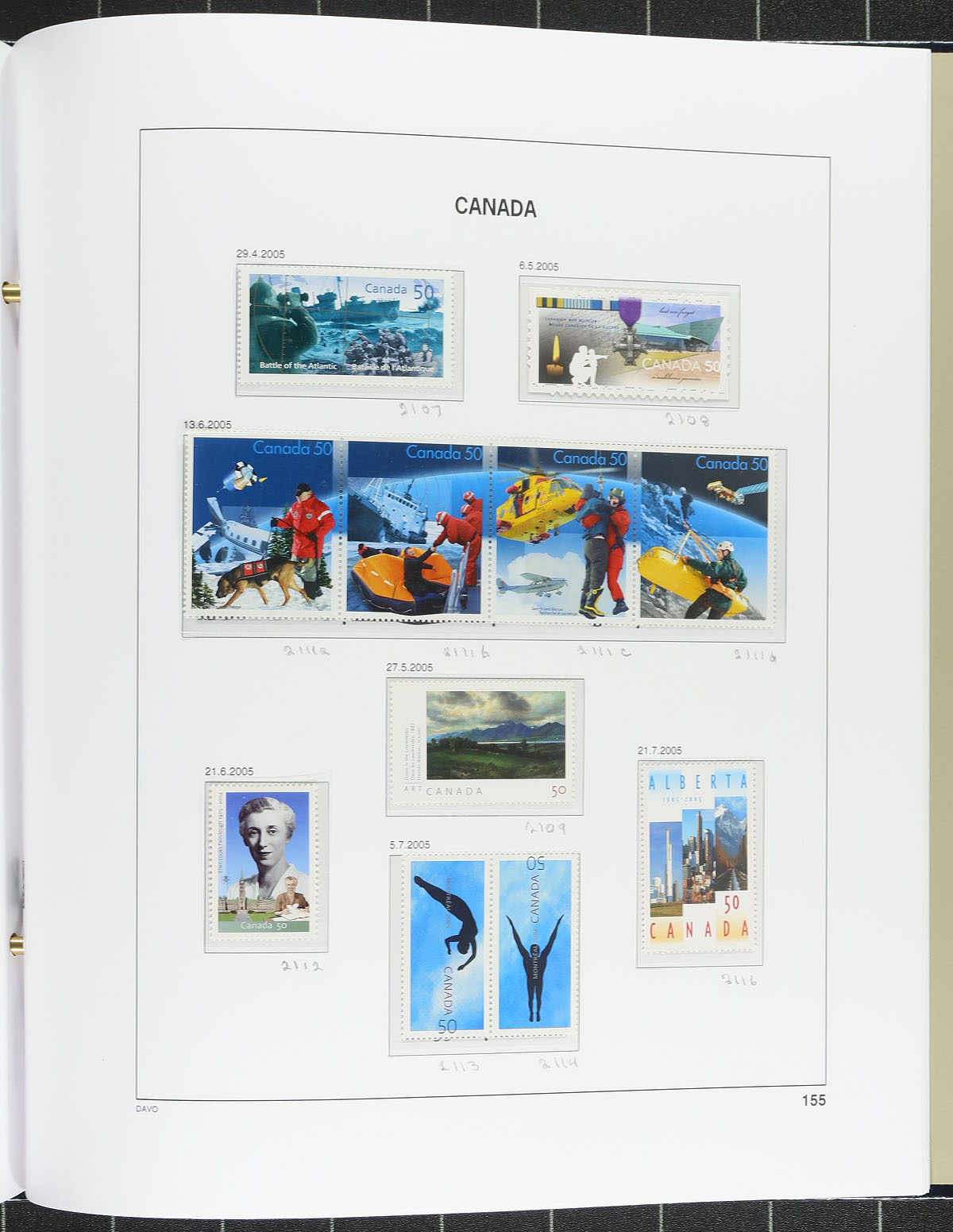 Deluxe DAVO Hingeless Canada Album (Volume II, 1999-2005) with matching slipcase, containing 413 stamps and 49 souvenir sheets, all Never Hinged and largely complete for the period. The album alone would retail for at least a couple hundred dollars, and is in excellent condition. Conservatively valued for the total usable postage. Total face value =