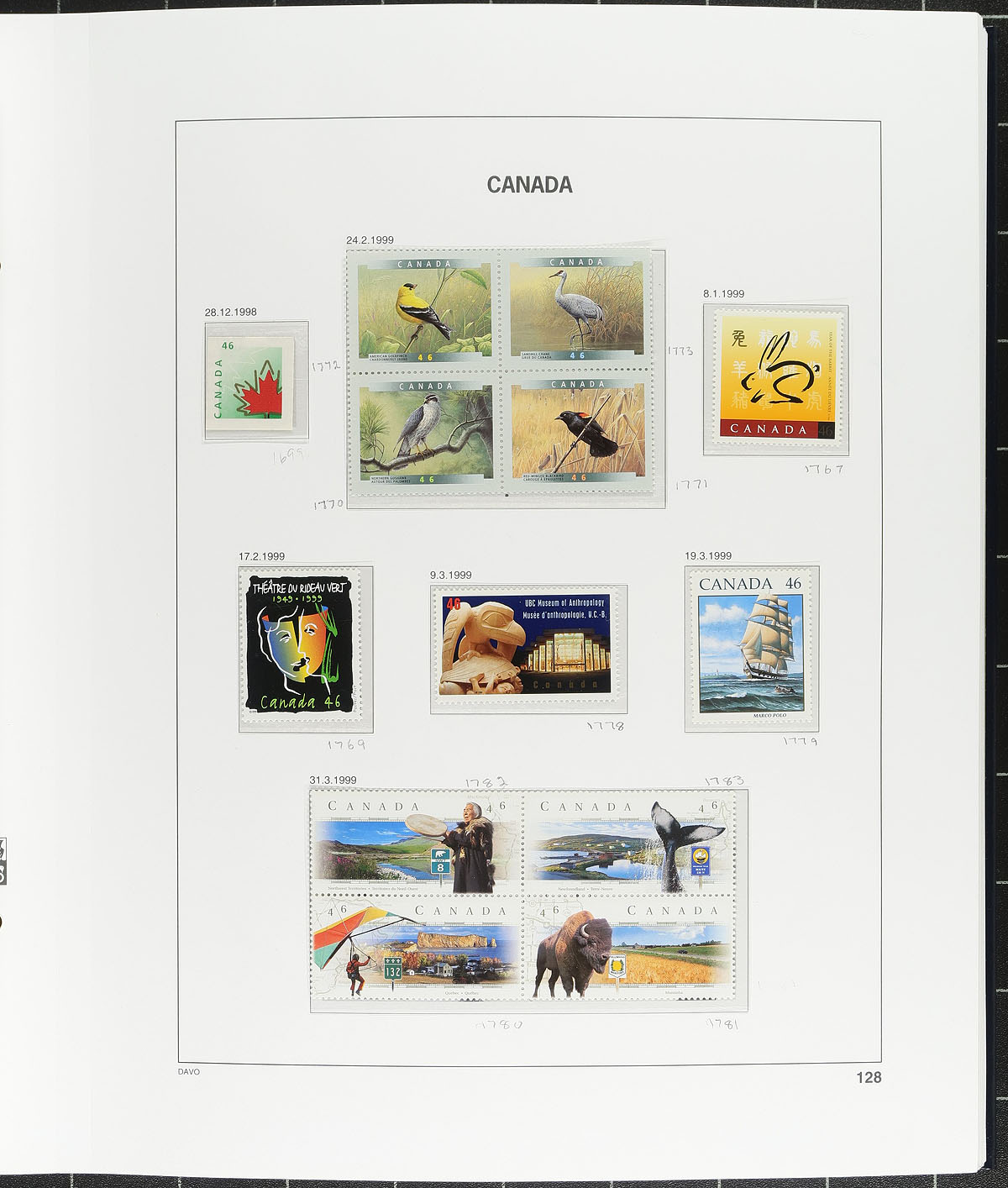 Deluxe DAVO Hingeless Canada Album (Volume II, 1999-2005) with matching slipcase, containing 413 stamps and 49 souvenir sheets, all Never Hinged and largely complete for the period. The album alone would retail for at least a couple hundred dollars, and is in excellent condition. Conservatively valued for the total usable postage. Total face value =