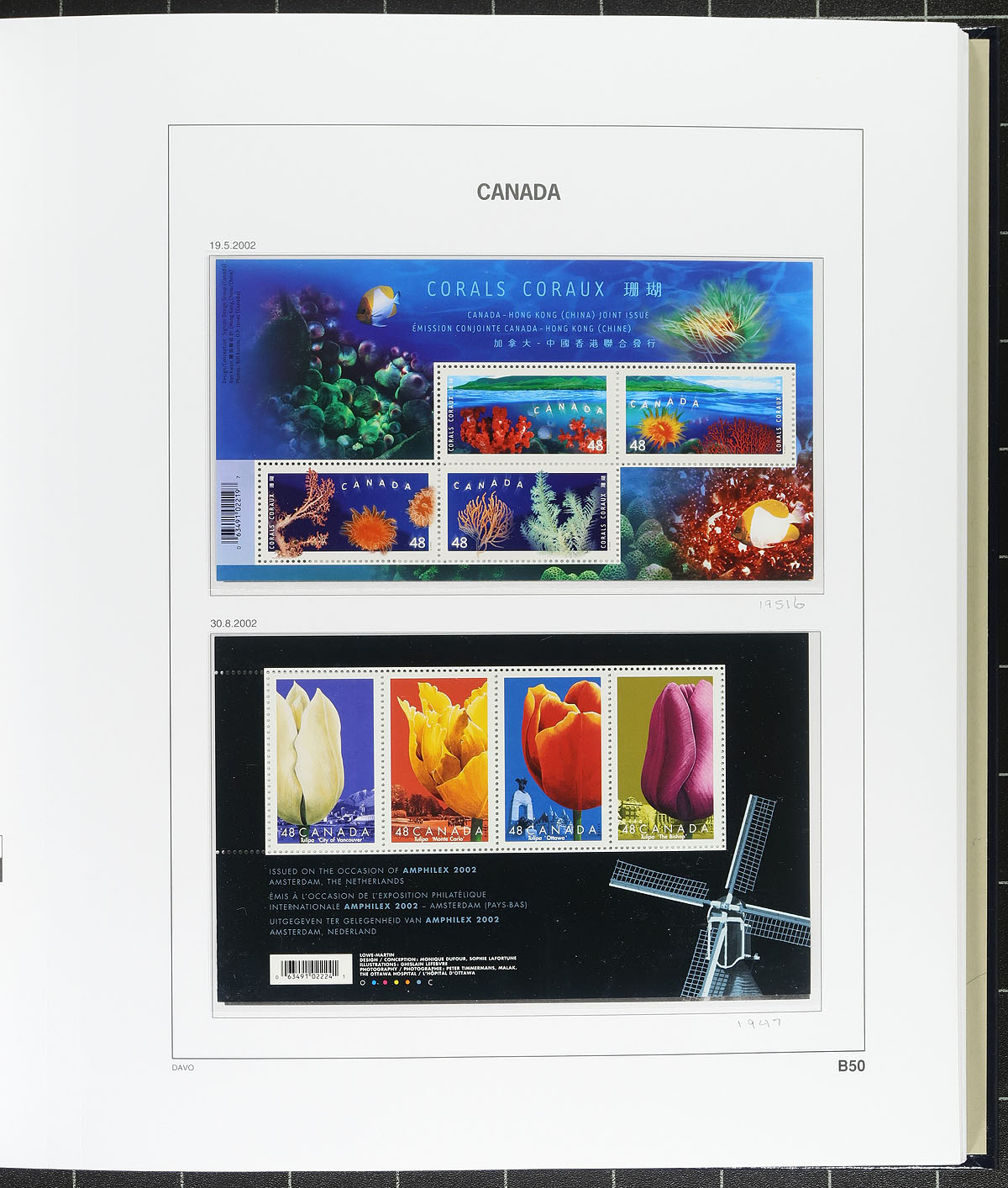 Deluxe DAVO Hingeless Canada Album (Volume II, 1999-2005) with matching slipcase, containing 413 stamps and 49 souvenir sheets, all Never Hinged and largely complete for the period. The album alone would retail for at least a couple hundred dollars, and is in excellent condition. Conservatively valued for the total usable postage. Total face value =