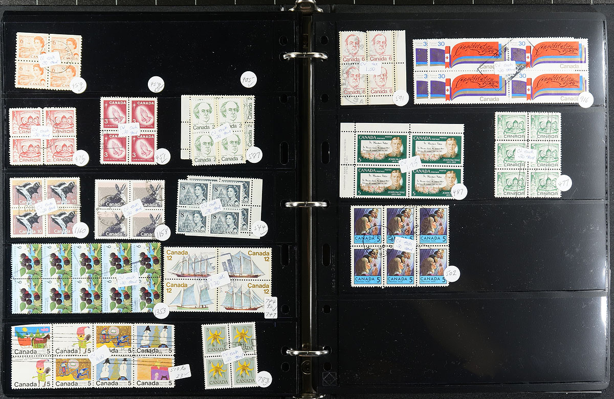 Used Blocks. A Unisafe brand block album, filled with 479 used blocks from the 1930's to early 2000's, including Plate Blocks. Noted some duplication, but also a nice variety spanning the decades, with many nicely cancelled. Estimate =