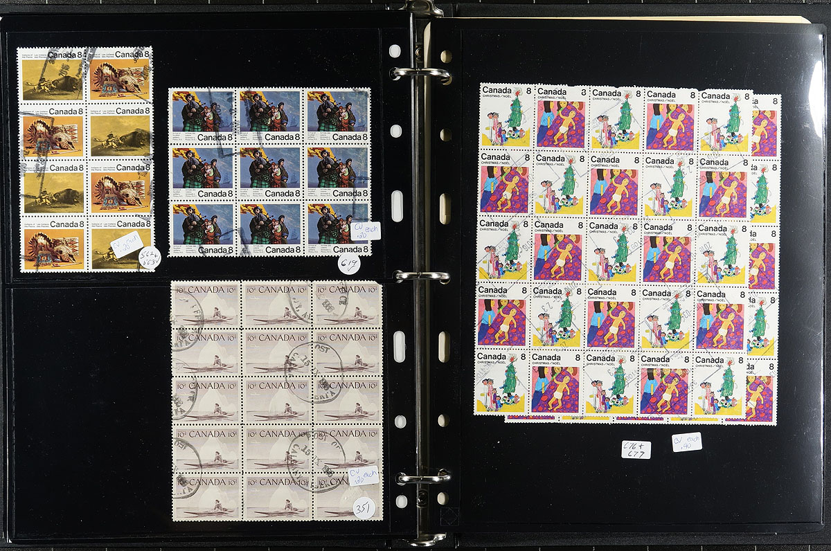 Used Blocks. A Unisafe brand block album, filled with 479 used blocks from the 1930's to early 2000's, including Plate Blocks. Noted some duplication, but also a nice variety spanning the decades, with many nicely cancelled. Estimate =