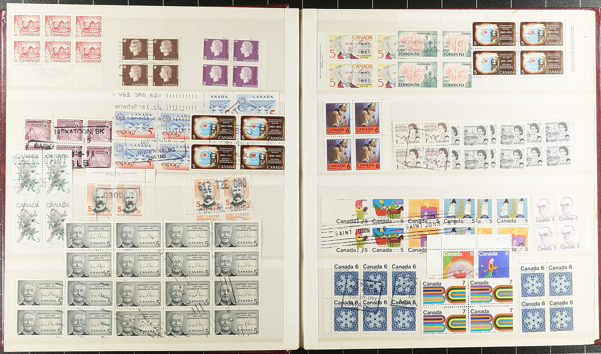 Used Block Accumulation. A collector's assembly of used blocks, arranged in two Lighthouse stockbooks, one designated "CDS Blocks", the other "NON-CDS Blocks". Noted several better items, ranging from George V to QEII, including high-values, booklet panes, plate blocks etc. Nice quality overall, with two nice stockbooks that would cost $40 alone these days. Estimate =