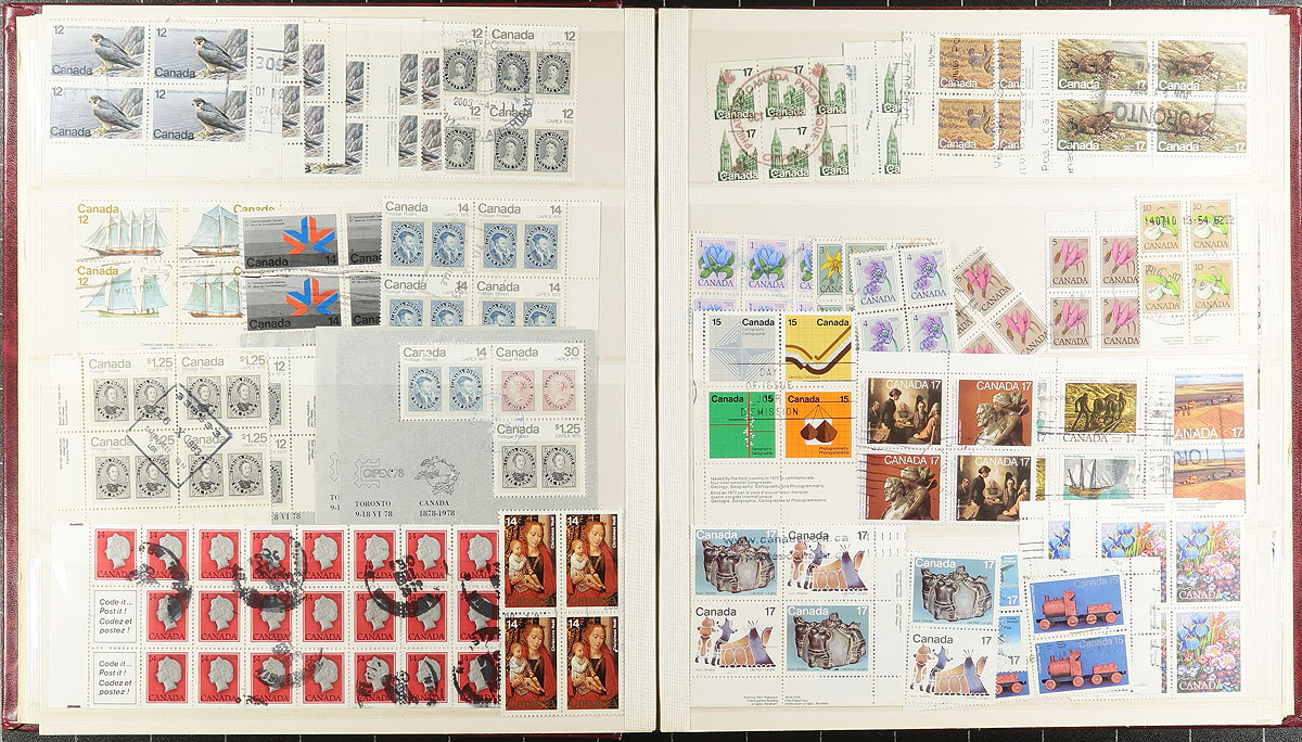 Used Block Accumulation. A collector's assembly of used blocks, arranged in two Lighthouse stockbooks, one designated "CDS Blocks", the other "NON-CDS Blocks". Noted several better items, ranging from George V to QEII, including high-values, booklet panes, plate blocks etc. Nice quality overall, with two nice stockbooks that would cost $40 alone these days. Estimate =