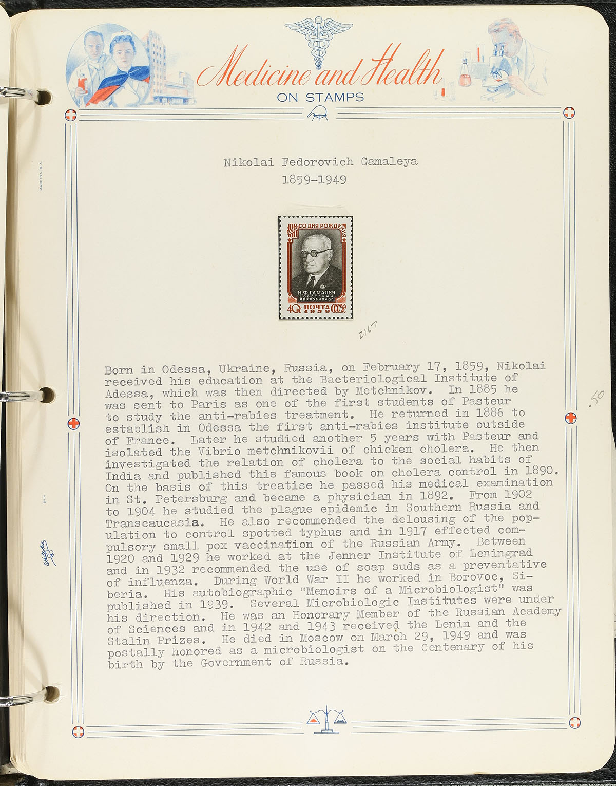 Men of Medicine Topical Collection. A 2-volume collection, in specially produced "White Ace" albums / pages (about 100 pages total) containing singles and sets, all featuring "Men of Medicine" with extensive research typed on each page. Over 325 stamps in total, with a catalogue value that would likely be +/- $500.00 combined. Estimate =