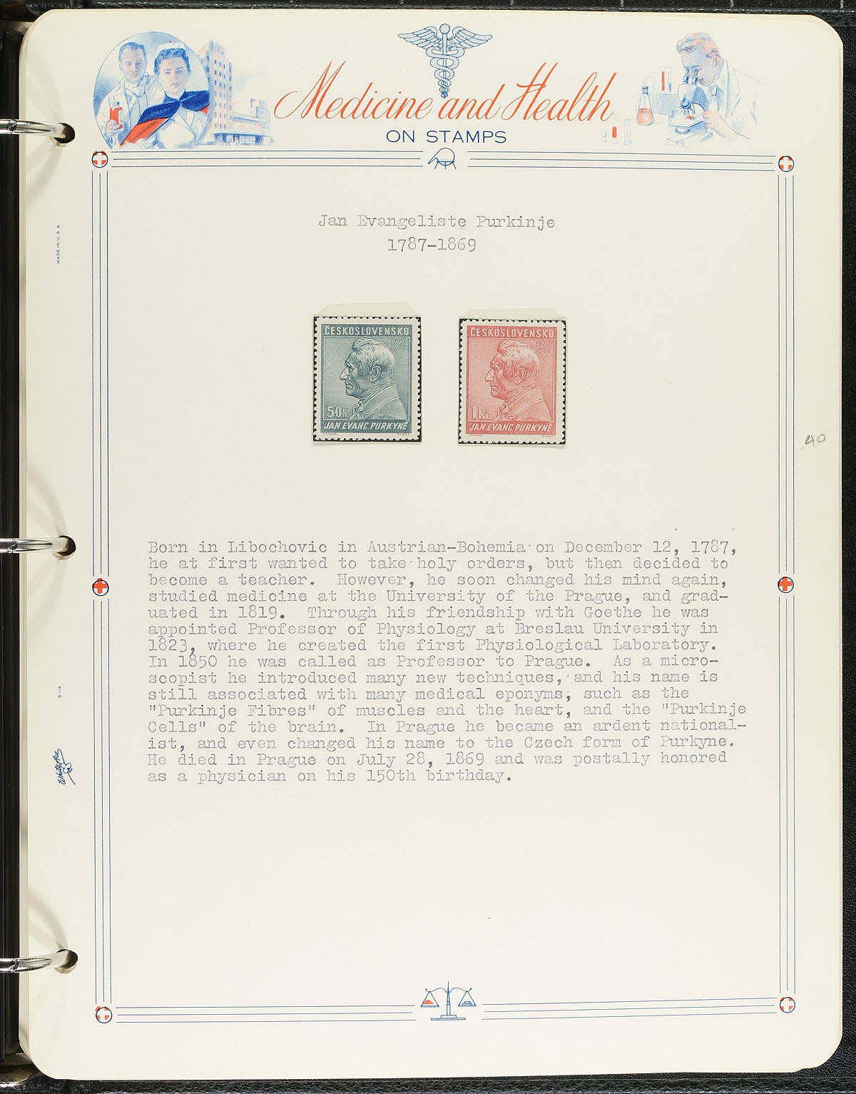 Men of Medicine Topical Collection. A 2-volume collection, in specially produced "White Ace" albums / pages (about 100 pages total) containing singles and sets, all featuring "Men of Medicine" with extensive research typed on each page. Over 325 stamps in total, with a catalogue value that would likely be +/- $500.00 combined. Estimate =