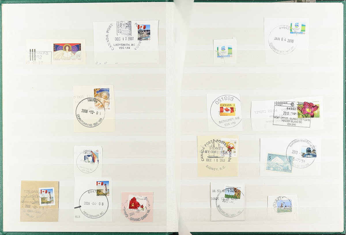 Diverse "catch all" consignment balance, including 22 Airmail First Flight Covers (on stockpages, in binder), 2010 Vancouver Olympics "Gold Medal Winners" collection in album with souvenir sheets and special postmarks (available at the venue only), a couple dozen QEII complete booklets, a bundle of Postal Stationery (dozens, including the "Birds of Canada" letter-writing kit), a bundle of 125 "stamp correspondence" covers from receiving philatelic mail (including Worldwide as well) and a 16-page Lighthouse stockbook with "CDS on Piece" stamps / covers / postcards neatly cancelled with hand-applied postmarks. Clean material and well organized throughout. Estimate =