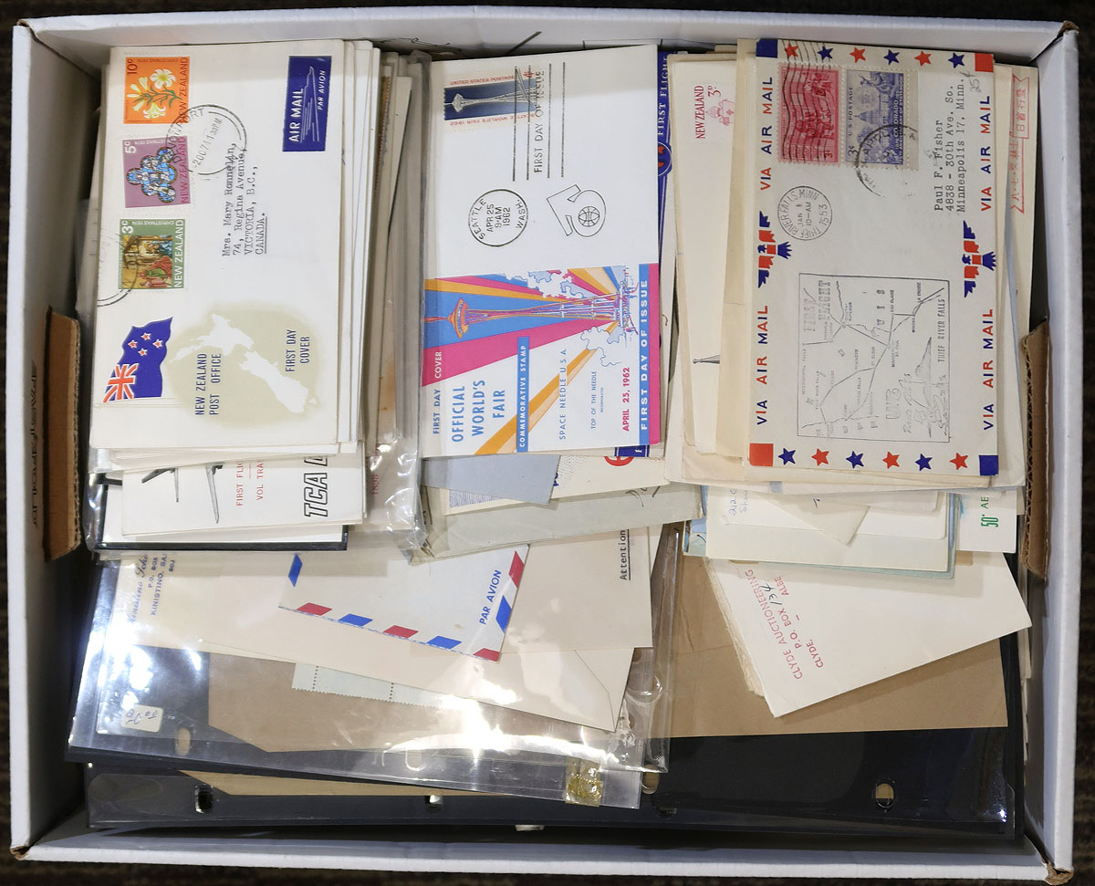 Bankers Box # 2. A hoard of roughly 1,500 worldwide covers and postcards, generally ranging from early to modern, containing a bit of everything from across the globe, offered as received. We note a mix of both commercial mail and first day covers or commemorative covers, along with picture postcards, rates, postal stationery, corner cards, etc. A nice lot with much to offer and would make great "dollar bin" stock. The second of three boxes, all offered in this sale. Estimate =