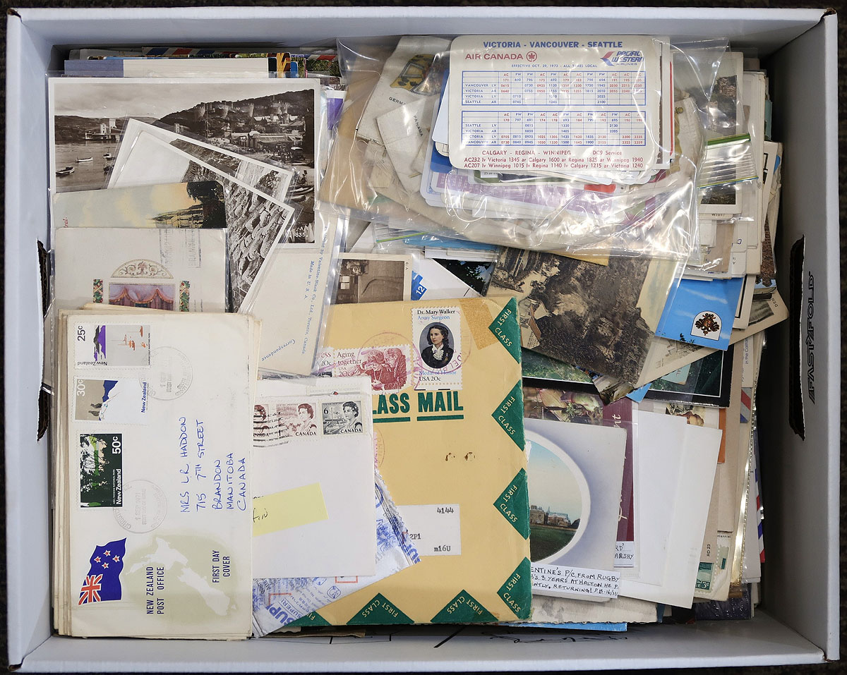 Bankers Box # 3. A hoard of roughly 1,500 worldwide covers and postcards, generally ranging from early to modern, containing a bit of everything from across the globe, offered as received. We note a mix of both commercial mail and first day covers or commemorative covers, along with picture postcards, rates, postal stationery, corner cards, etc. A nice lot with much to offer and would make great "dollar bin" stock. The third and final of three boxes, all offered in this sale. Estimate =