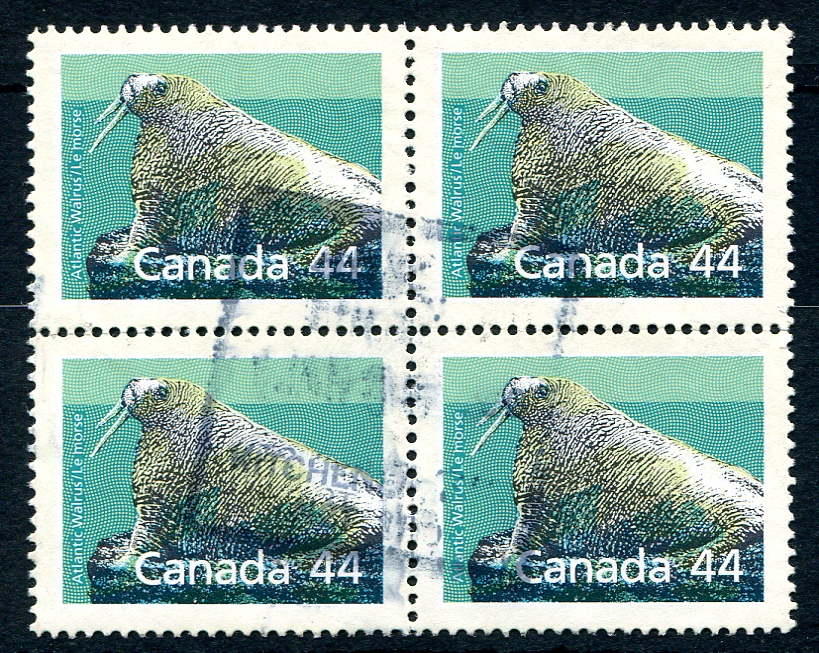 Seldom seen used block of four of the rare 44c Walrus definitive on Slater paper, in the November 1989 perf 13.8 x 13.1. This is the second rarest of the 1988-1990 Mammal definitive varieties. 2024 Unitrade =