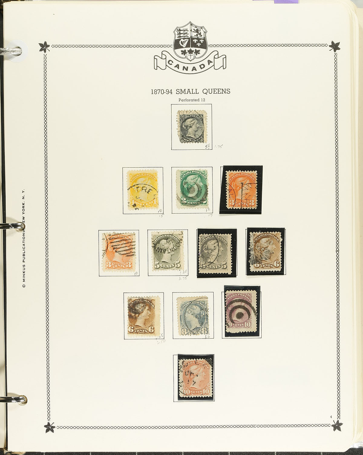Nice used collection of Canada in a Minkus album 1870's-1974, containing many hundreds of stamps, essentially beginning with 17 used Small Queens, including 10c (x2), small selection of Jubilees, partial Leaf and Numeral sets (noting a nicely centered 20c Numeral), partial set of Edwards, and continues with full sets, appearing to be a complete collection up to 1974, noting Quebecs, Admirals, Scrolls, Arch, etc. The collection also includes a decent representation of back of the book issues, and additional material on extra pages. Postmark interest includes some "socked on the nose" town cancels. A few faults on a few of the early stamps, overall still a nice Canada used collection. Estimate =