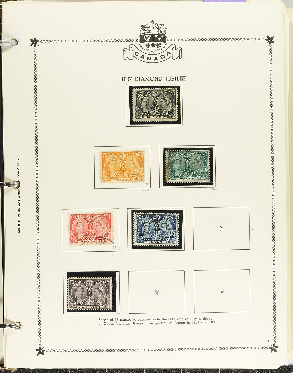 Nice used collection of Canada in a Minkus album 1870's-1974, containing many hundreds of stamps, essentially beginning with 17 used Small Queens, including 10c (x2), small selection of Jubilees, partial Leaf and Numeral sets (noting a nicely centered 20c Numeral), partial set of Edwards, and continues with full sets, appearing to be a complete collection up to 1974, noting Quebecs, Admirals, Scrolls, Arch, etc. The collection also includes a decent representation of back of the book issues, and additional material on extra pages. Postmark interest includes some "socked on the nose" town cancels. A few faults on a few of the early stamps, overall still a nice Canada used collection. Estimate =