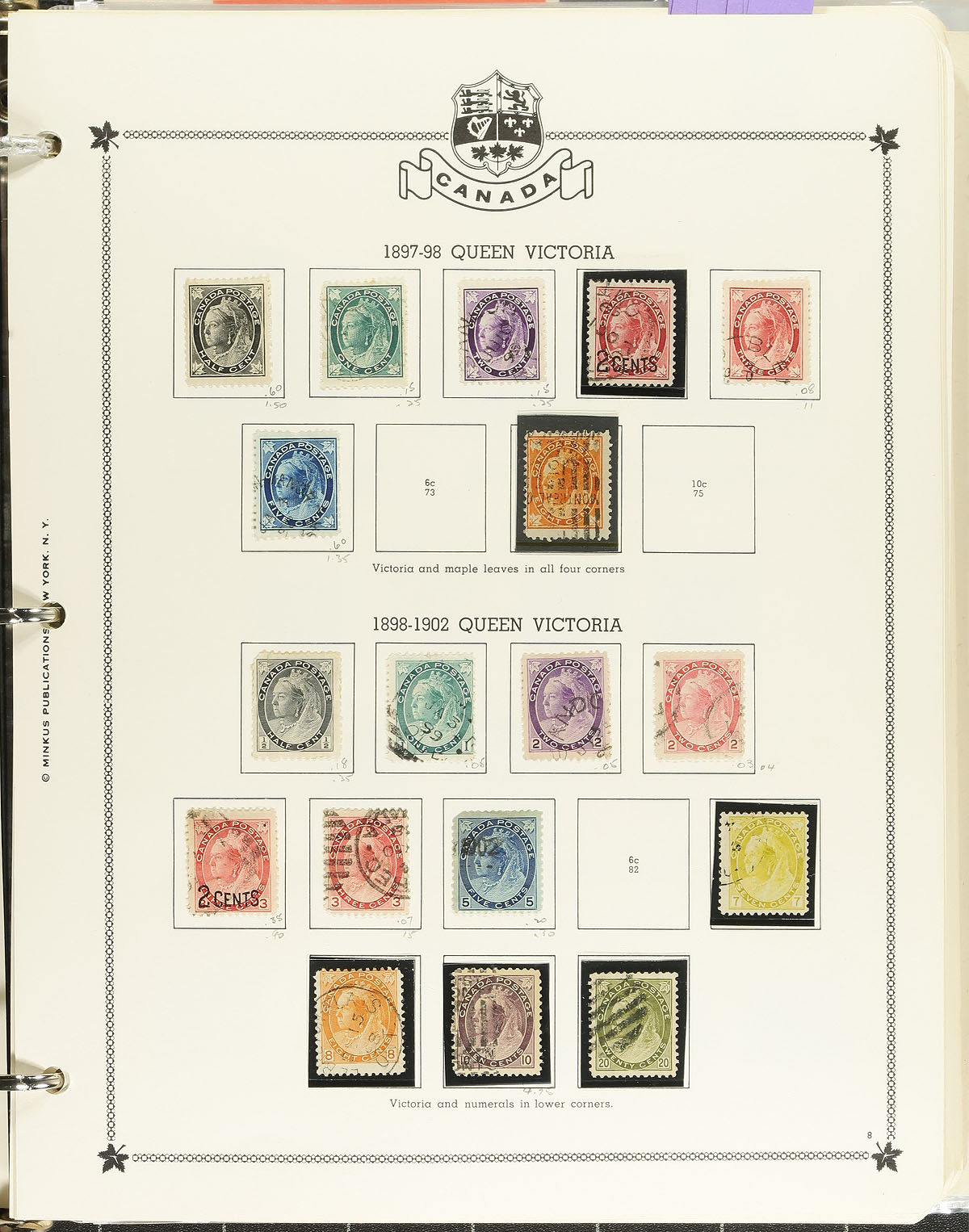 Nice used collection of Canada in a Minkus album 1870's-1974, containing many hundreds of stamps, essentially beginning with 17 used Small Queens, including 10c (x2), small selection of Jubilees, partial Leaf and Numeral sets (noting a nicely centered 20c Numeral), partial set of Edwards, and continues with full sets, appearing to be a complete collection up to 1974, noting Quebecs, Admirals, Scrolls, Arch, etc. The collection also includes a decent representation of back of the book issues, and additional material on extra pages. Postmark interest includes some "socked on the nose" town cancels. A few faults on a few of the early stamps, overall still a nice Canada used collection. Estimate =