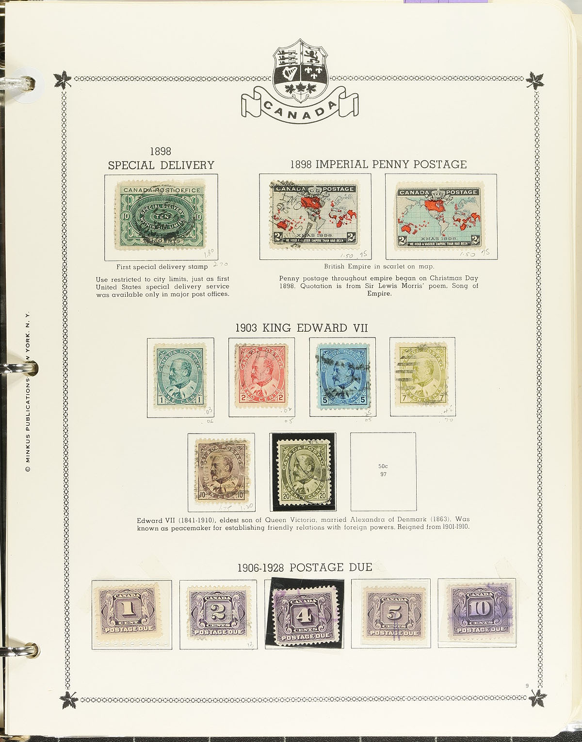 Nice used collection of Canada in a Minkus album 1870's-1974, containing many hundreds of stamps, essentially beginning with 17 used Small Queens, including 10c (x2), small selection of Jubilees, partial Leaf and Numeral sets (noting a nicely centered 20c Numeral), partial set of Edwards, and continues with full sets, appearing to be a complete collection up to 1974, noting Quebecs, Admirals, Scrolls, Arch, etc. The collection also includes a decent representation of back of the book issues, and additional material on extra pages. Postmark interest includes some "socked on the nose" town cancels. A few faults on a few of the early stamps, overall still a nice Canada used collection. Estimate =