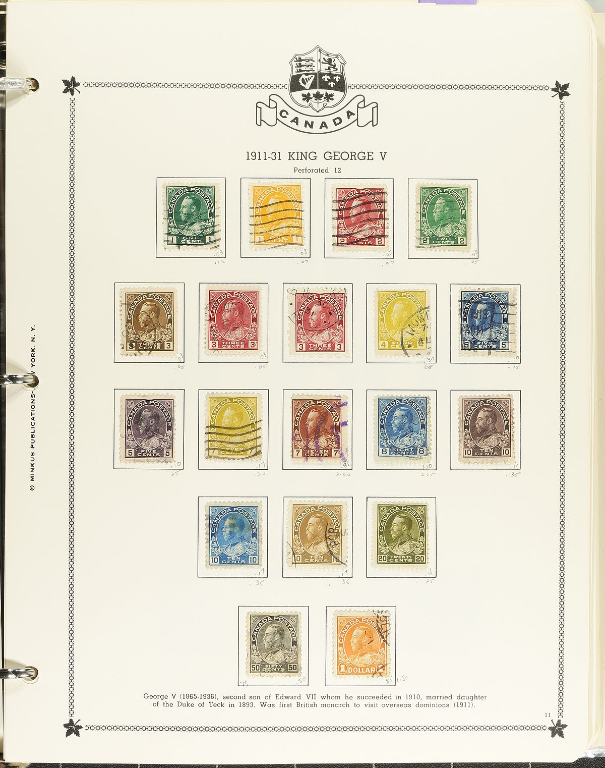 Nice used collection of Canada in a Minkus album 1870's-1974, containing many hundreds of stamps, essentially beginning with 17 used Small Queens, including 10c (x2), small selection of Jubilees, partial Leaf and Numeral sets (noting a nicely centered 20c Numeral), partial set of Edwards, and continues with full sets, appearing to be a complete collection up to 1974, noting Quebecs, Admirals, Scrolls, Arch, etc. The collection also includes a decent representation of back of the book issues, and additional material on extra pages. Postmark interest includes some "socked on the nose" town cancels. A few faults on a few of the early stamps, overall still a nice Canada used collection. Estimate =