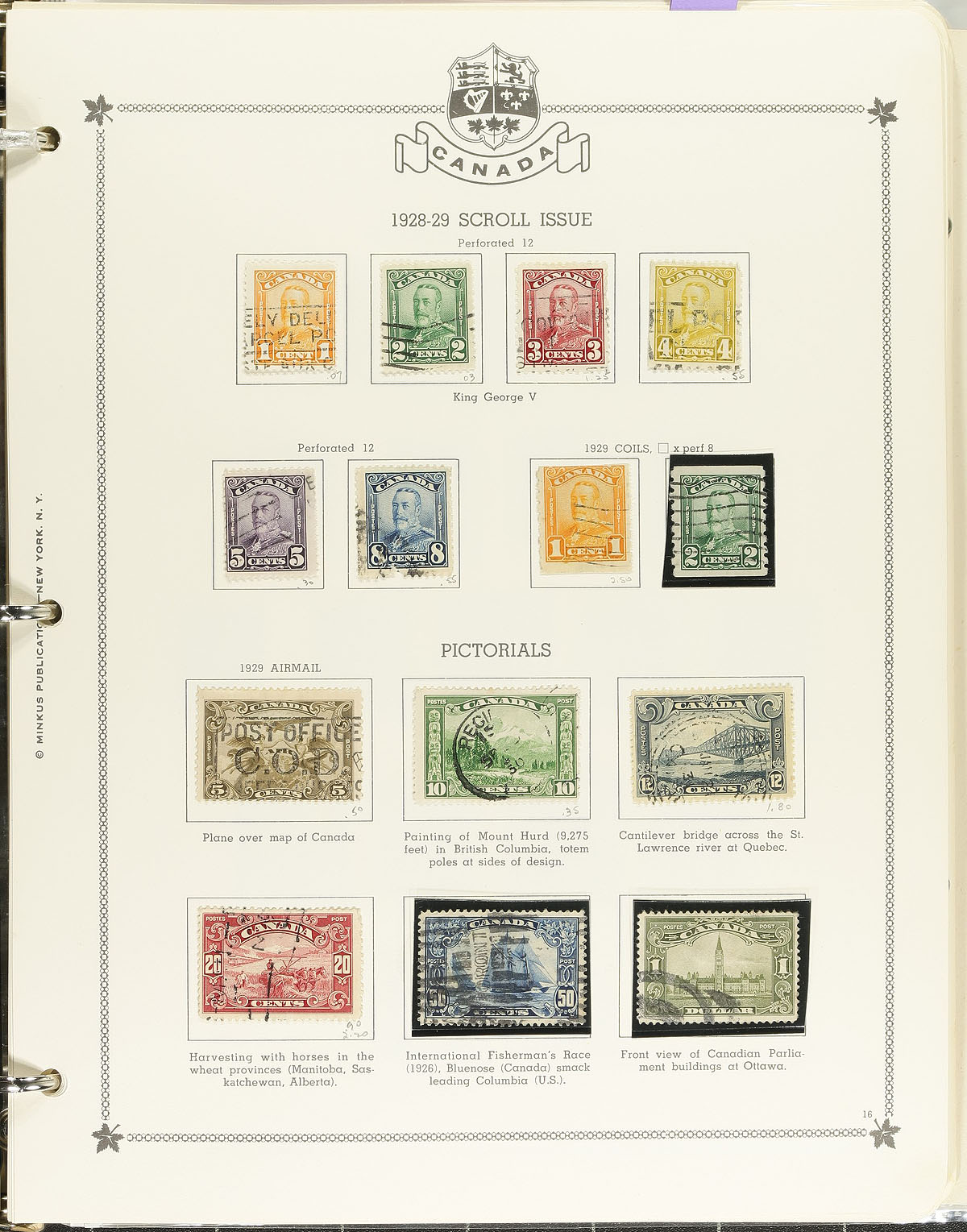 Nice used collection of Canada in a Minkus album 1870's-1974, containing many hundreds of stamps, essentially beginning with 17 used Small Queens, including 10c (x2), small selection of Jubilees, partial Leaf and Numeral sets (noting a nicely centered 20c Numeral), partial set of Edwards, and continues with full sets, appearing to be a complete collection up to 1974, noting Quebecs, Admirals, Scrolls, Arch, etc. The collection also includes a decent representation of back of the book issues, and additional material on extra pages. Postmark interest includes some "socked on the nose" town cancels. A few faults on a few of the early stamps, overall still a nice Canada used collection. Estimate =