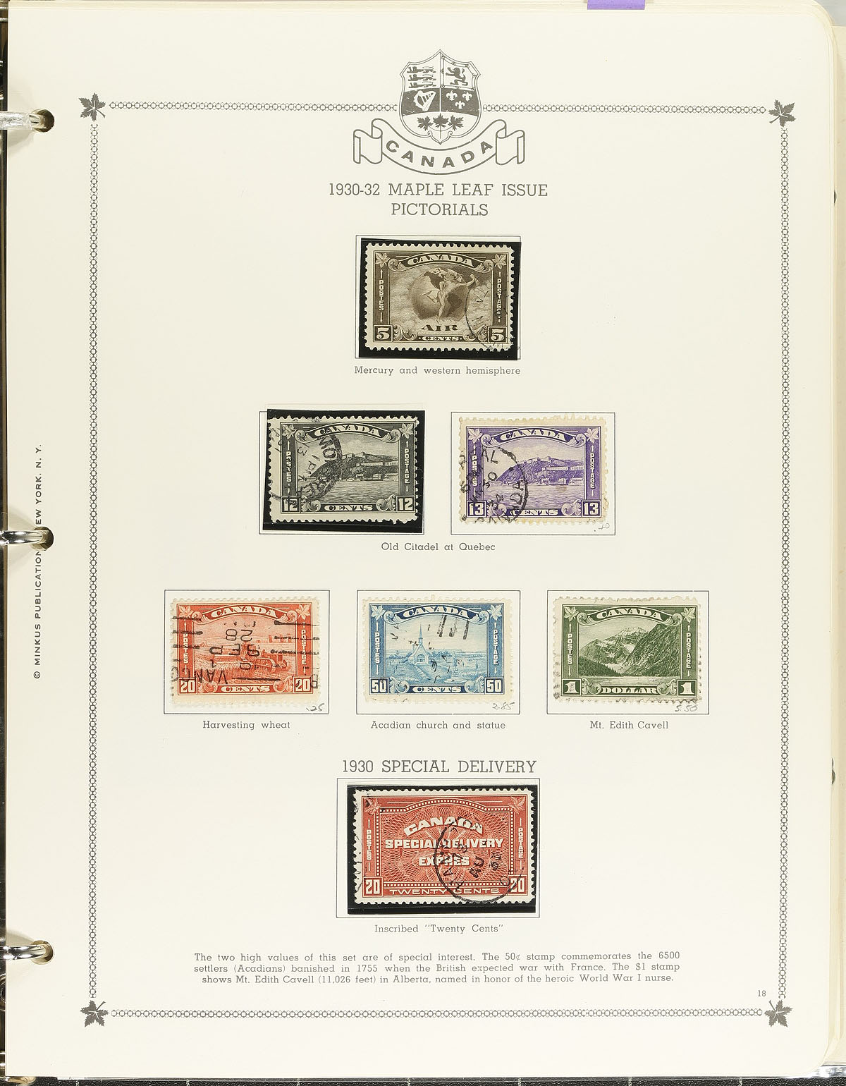 Nice used collection of Canada in a Minkus album 1870's-1974, containing many hundreds of stamps, essentially beginning with 17 used Small Queens, including 10c (x2), small selection of Jubilees, partial Leaf and Numeral sets (noting a nicely centered 20c Numeral), partial set of Edwards, and continues with full sets, appearing to be a complete collection up to 1974, noting Quebecs, Admirals, Scrolls, Arch, etc. The collection also includes a decent representation of back of the book issues, and additional material on extra pages. Postmark interest includes some "socked on the nose" town cancels. A few faults on a few of the early stamps, overall still a nice Canada used collection. Estimate =