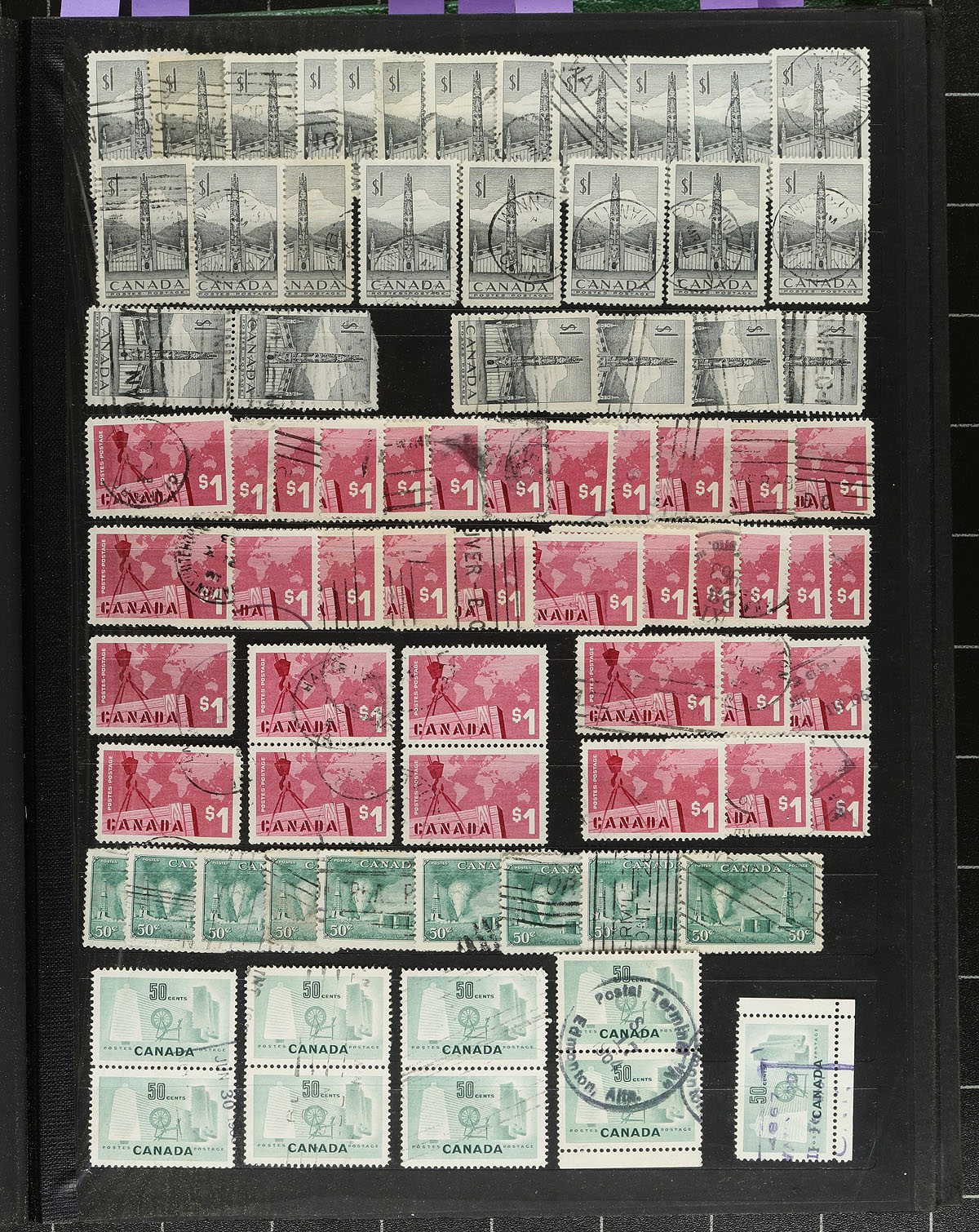 Well organized accumulation of used Canada, 1950's-1980's, containing well over 1,000 stamps in two Lighthouse stockbooks. The larger stockbook contains high denomination definitive and commemorative issues from the 1950's up to the Fruit Tree issues, with the smaller stockbook containing lower denomination stamps, along with mini panes, precancels, noting many with Winnipeg tagging. A potentially high cataloguing lot, and should have some postmark finds for the dedicated collector. Estimate =