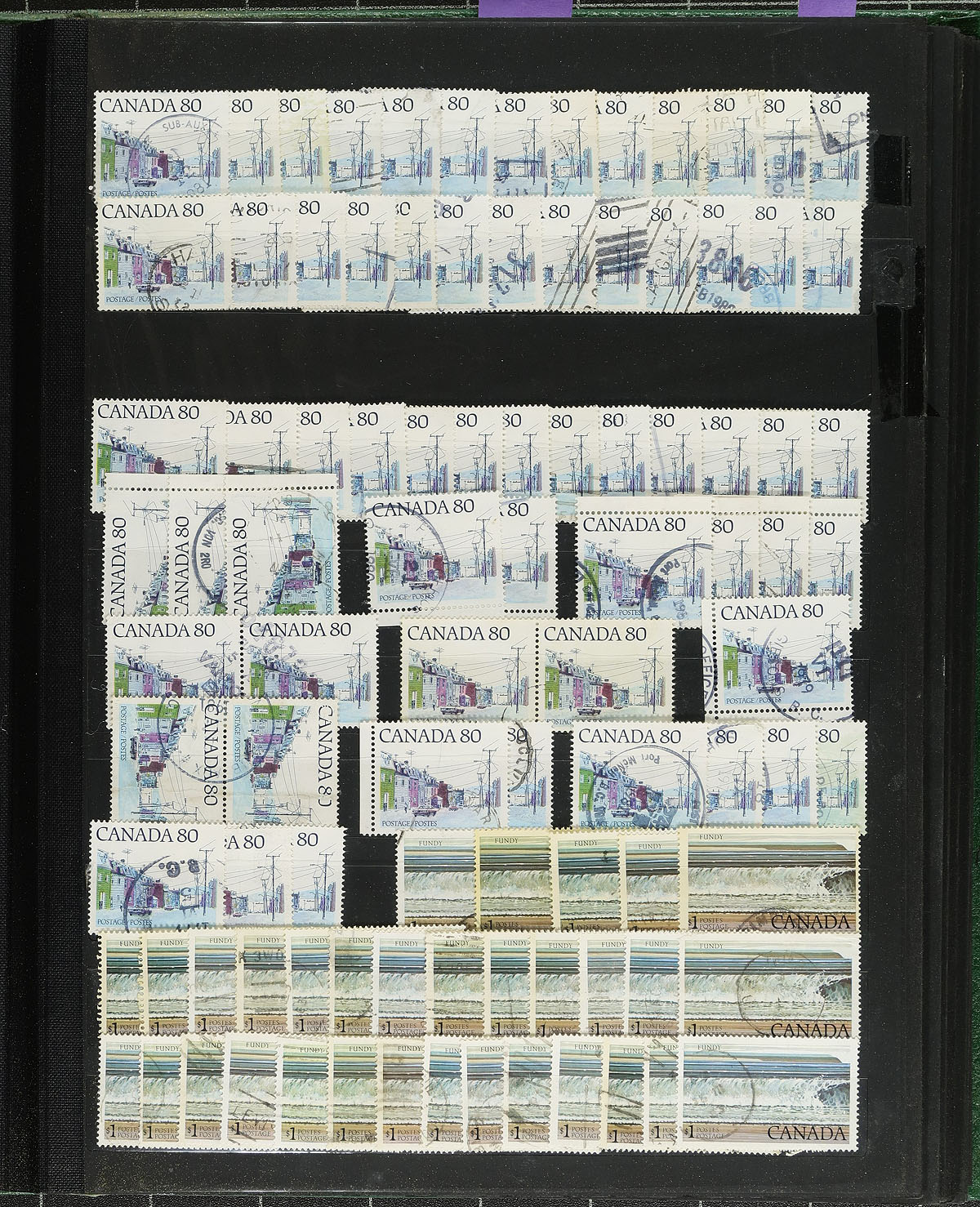 Well organized accumulation of used Canada, 1950's-1980's, containing well over 1,000 stamps in two Lighthouse stockbooks. The larger stockbook contains high denomination definitive and commemorative issues from the 1950's up to the Fruit Tree issues, with the smaller stockbook containing lower denomination stamps, along with mini panes, precancels, noting many with Winnipeg tagging. A potentially high cataloguing lot, and should have some postmark finds for the dedicated collector. Estimate =