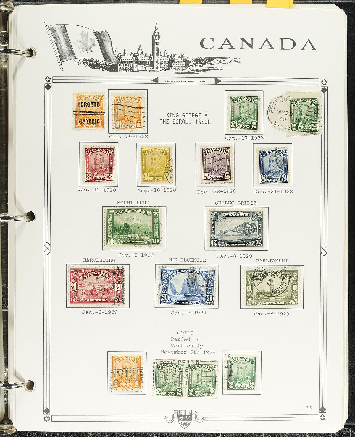 Pleasant collection of used Canada, 1851-1992, containing many hundreds of stamps on Parliament album pages in a binder. The collection begins with early examples with Scott #s 4 (faulty), 14, 15, 17, 19, 21, 22, 24, 25, 27, 29, 30, with 14 Small Queens, including 10c (x2), 20c and 50c Widow Weeds, 7 Jubilees (including 20c), sets of Leafs, Numerals, Edwards, mint no gum set of Quebecs, and back to used sets of Admirals, Scrolls (noting a nice $1 Parliament with cds postmark), and appears to be 95% complete up to 1992. The collection also includes selections of back of the book material, a few perfins and precancels. The lot also includes the owner's accumulation of used worldwide stamps (including more Canada), in a variety of formats, with better finds left to the dedicated collector. A few faults with a few of the early stamps, still a nice collection for any collector. Estimate =