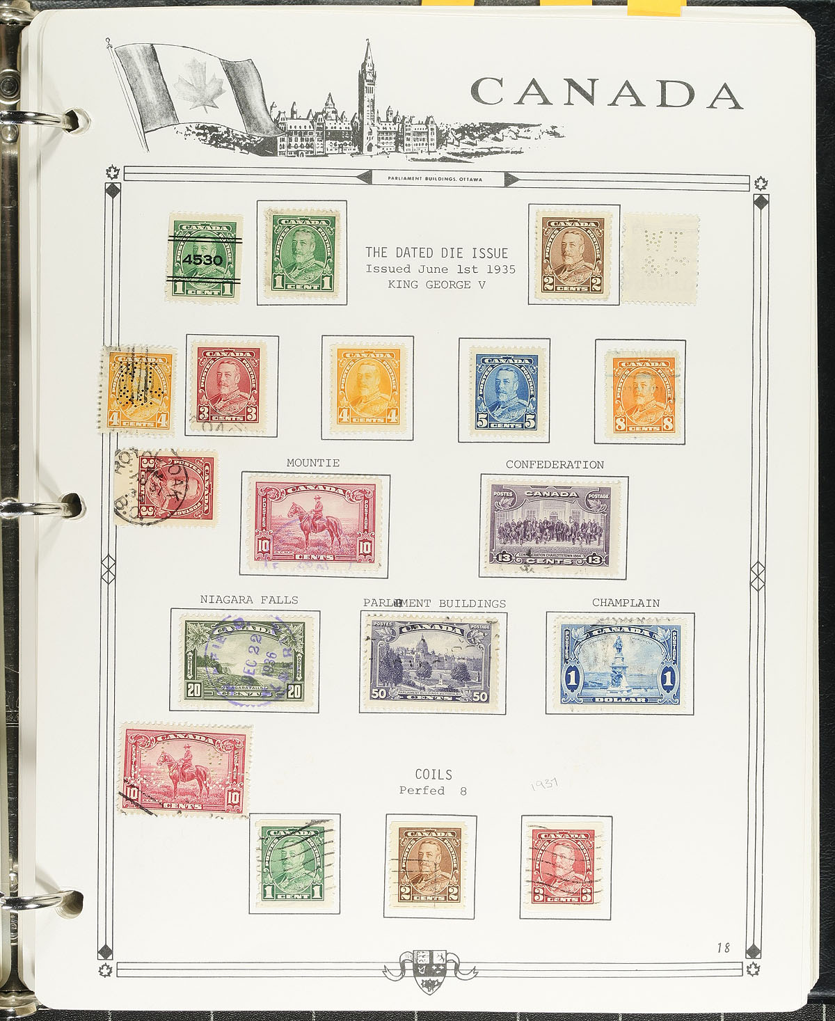 Pleasant collection of used Canada, 1851-1992, containing many hundreds of stamps on Parliament album pages in a binder. The collection begins with early examples with Scott #s 4 (faulty), 14, 15, 17, 19, 21, 22, 24, 25, 27, 29, 30, with 14 Small Queens, including 10c (x2), 20c and 50c Widow Weeds, 7 Jubilees (including 20c), sets of Leafs, Numerals, Edwards, mint no gum set of Quebecs, and back to used sets of Admirals, Scrolls (noting a nice $1 Parliament with cds postmark), and appears to be 95% complete up to 1992. The collection also includes selections of back of the book material, a few perfins and precancels. The lot also includes the owner's accumulation of used worldwide stamps (including more Canada), in a variety of formats, with better finds left to the dedicated collector. A few faults with a few of the early stamps, still a nice collection for any collector. Estimate =