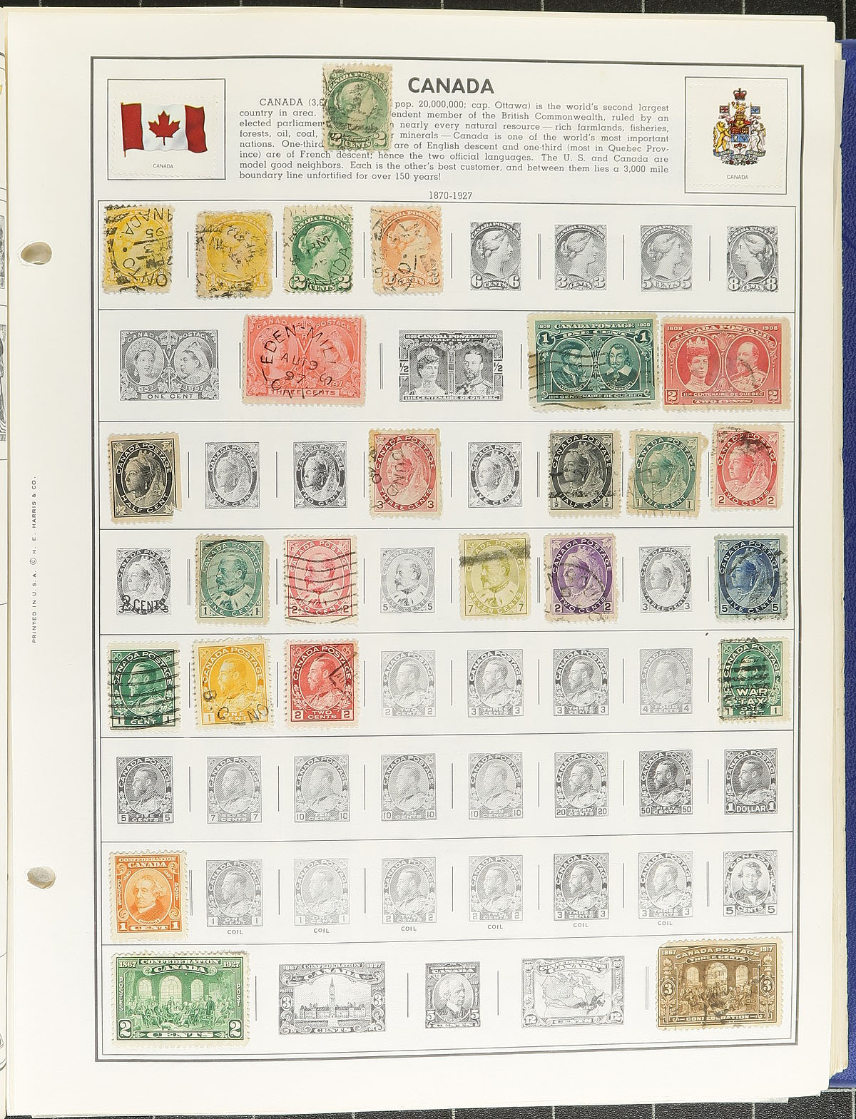 Pleasant collection of used Canada, 1851-1992, containing many hundreds of stamps on Parliament album pages in a binder. The collection begins with early examples with Scott #s 4 (faulty), 14, 15, 17, 19, 21, 22, 24, 25, 27, 29, 30, with 14 Small Queens, including 10c (x2), 20c and 50c Widow Weeds, 7 Jubilees (including 20c), sets of Leafs, Numerals, Edwards, mint no gum set of Quebecs, and back to used sets of Admirals, Scrolls (noting a nice $1 Parliament with cds postmark), and appears to be 95% complete up to 1992. The collection also includes selections of back of the book material, a few perfins and precancels. The lot also includes the owner's accumulation of used worldwide stamps (including more Canada), in a variety of formats, with better finds left to the dedicated collector. A few faults with a few of the early stamps, still a nice collection for any collector. Estimate =