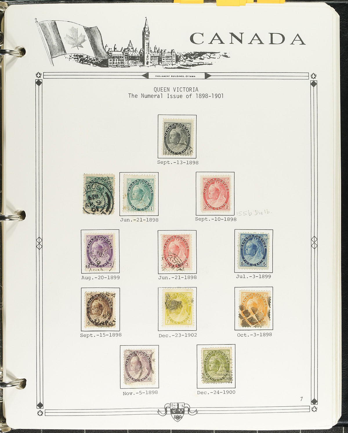 Pleasant collection of used Canada, 1851-1992, containing many hundreds of stamps on Parliament album pages in a binder. The collection begins with early examples with Scott #s 4 (faulty), 14, 15, 17, 19, 21, 22, 24, 25, 27, 29, 30, with 14 Small Queens, including 10c (x2), 20c and 50c Widow Weeds, 7 Jubilees (including 20c), sets of Leafs, Numerals, Edwards, mint no gum set of Quebecs, and back to used sets of Admirals, Scrolls (noting a nice $1 Parliament with cds postmark), and appears to be 95% complete up to 1992. The collection also includes selections of back of the book material, a few perfins and precancels. The lot also includes the owner's accumulation of used worldwide stamps (including more Canada), in a variety of formats, with better finds left to the dedicated collector. A few faults with a few of the early stamps, still a nice collection for any collector. Estimate =
