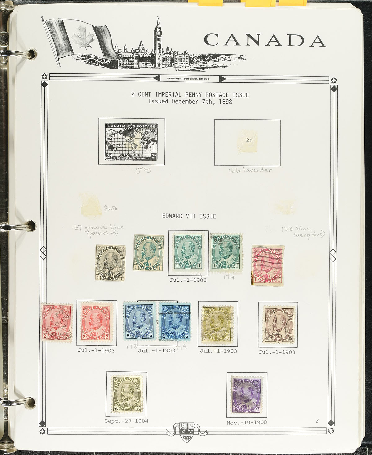 Pleasant collection of used Canada, 1851-1992, containing many hundreds of stamps on Parliament album pages in a binder. The collection begins with early examples with Scott #s 4 (faulty), 14, 15, 17, 19, 21, 22, 24, 25, 27, 29, 30, with 14 Small Queens, including 10c (x2), 20c and 50c Widow Weeds, 7 Jubilees (including 20c), sets of Leafs, Numerals, Edwards, mint no gum set of Quebecs, and back to used sets of Admirals, Scrolls (noting a nice $1 Parliament with cds postmark), and appears to be 95% complete up to 1992. The collection also includes selections of back of the book material, a few perfins and precancels. The lot also includes the owner's accumulation of used worldwide stamps (including more Canada), in a variety of formats, with better finds left to the dedicated collector. A few faults with a few of the early stamps, still a nice collection for any collector. Estimate =