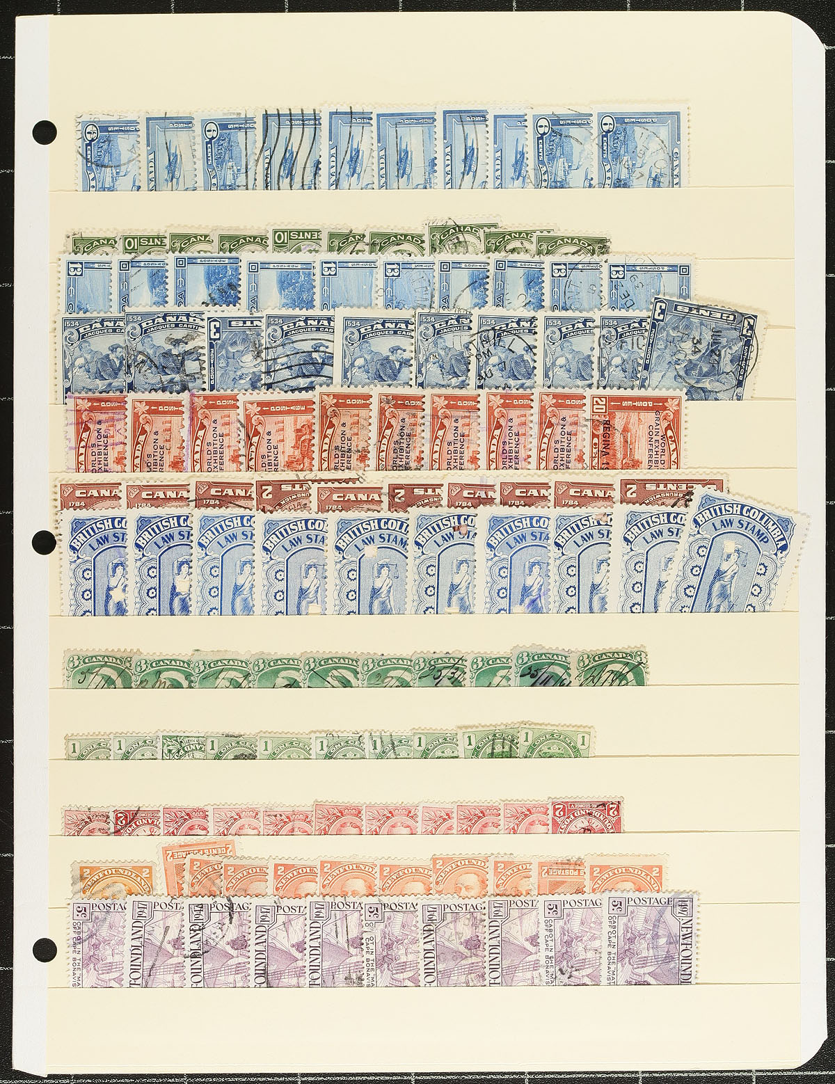 Stock of used Canada #1. Small Queens to the 1990's, containing well over 1,000 stamps in a variety of formats with roughly 70 album, stock, or manila pages. A spot check indicated low denomination Small Queens, Jubilees, Leafs up to Quebecs, with better representation from the Admirals to the 1940's (including a few sets), along with some modern material, varieties, etc. Postmark interest includes cds, duplex, split ring, a few squared circles, and more, noting many socked on the nose town cancels. Duplication up to 10 for some issues. A nice lot, with a potentially high catalogue value, for the used collector or postmark hunter. Estimate =