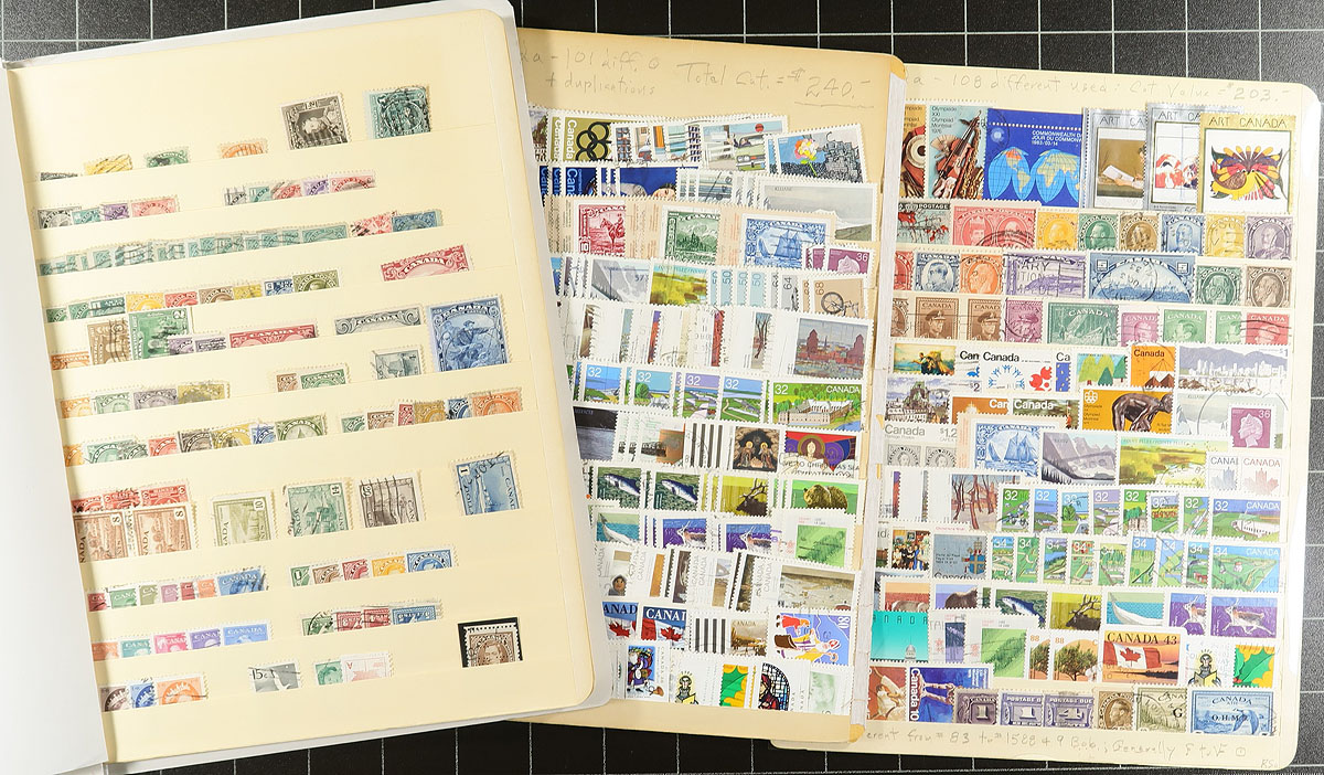 Stock of used Canada #1. Small Queens to the 1990's, containing well over 1,000 stamps in a variety of formats with roughly 70 album, stock, or manila pages. A spot check indicated low denomination Small Queens, Jubilees, Leafs up to Quebecs, with better representation from the Admirals to the 1940's (including a few sets), along with some modern material, varieties, etc. Postmark interest includes cds, duplex, split ring, a few squared circles, and more, noting many socked on the nose town cancels. Duplication up to 10 for some issues. A nice lot, with a potentially high catalogue value, for the used collector or postmark hunter. Estimate =