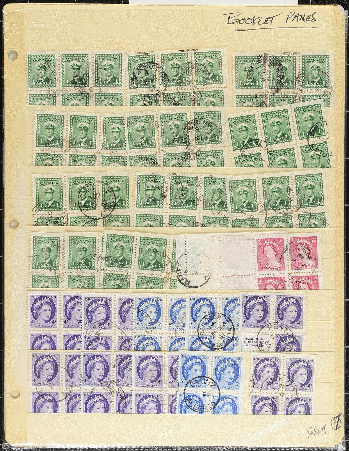 Stock of used Canada #1. Small Queens to the 1990's, containing well over 1,000 stamps in a variety of formats with roughly 70 album, stock, or manila pages. A spot check indicated low denomination Small Queens, Jubilees, Leafs up to Quebecs, with better representation from the Admirals to the 1940's (including a few sets), along with some modern material, varieties, etc. Postmark interest includes cds, duplex, split ring, a few squared circles, and more, noting many socked on the nose town cancels. Duplication up to 10 for some issues. A nice lot, with a potentially high catalogue value, for the used collector or postmark hunter. Estimate =