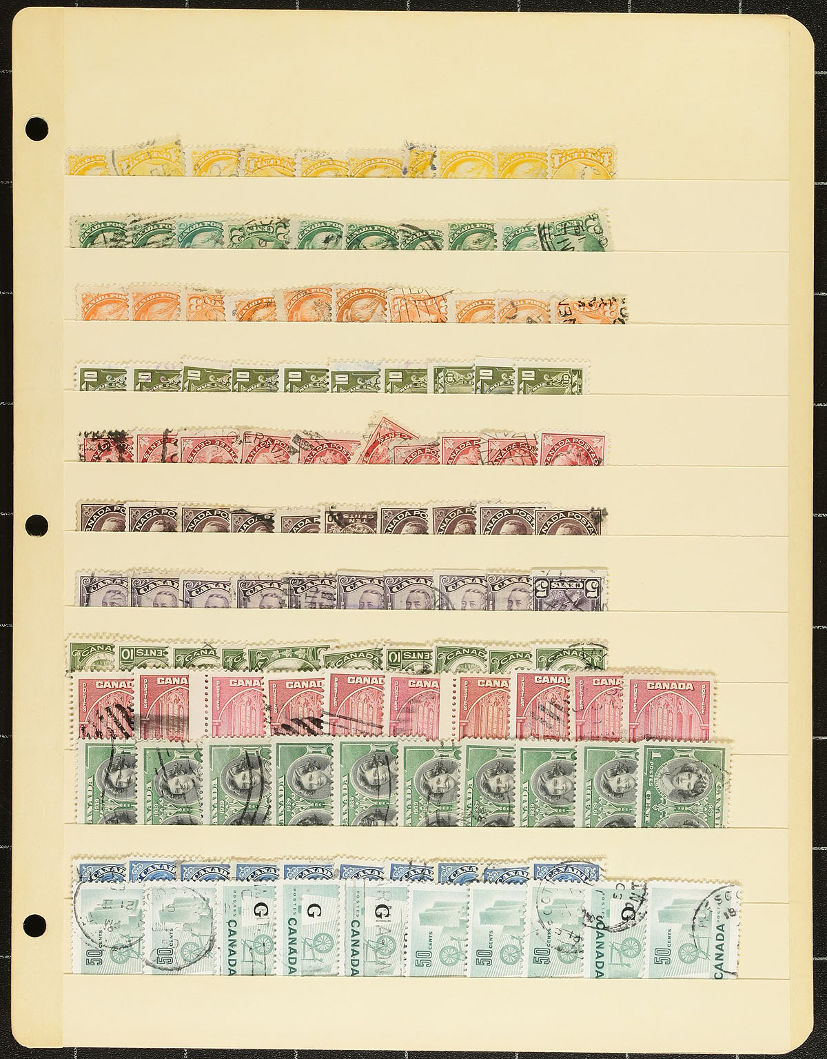 Stock of used Canada #1. Small Queens to the 1990's, containing well over 1,000 stamps in a variety of formats with roughly 70 album, stock, or manila pages. A spot check indicated low denomination Small Queens, Jubilees, Leafs up to Quebecs, with better representation from the Admirals to the 1940's (including a few sets), along with some modern material, varieties, etc. Postmark interest includes cds, duplex, split ring, a few squared circles, and more, noting many socked on the nose town cancels. Duplication up to 10 for some issues. A nice lot, with a potentially high catalogue value, for the used collector or postmark hunter. Estimate =