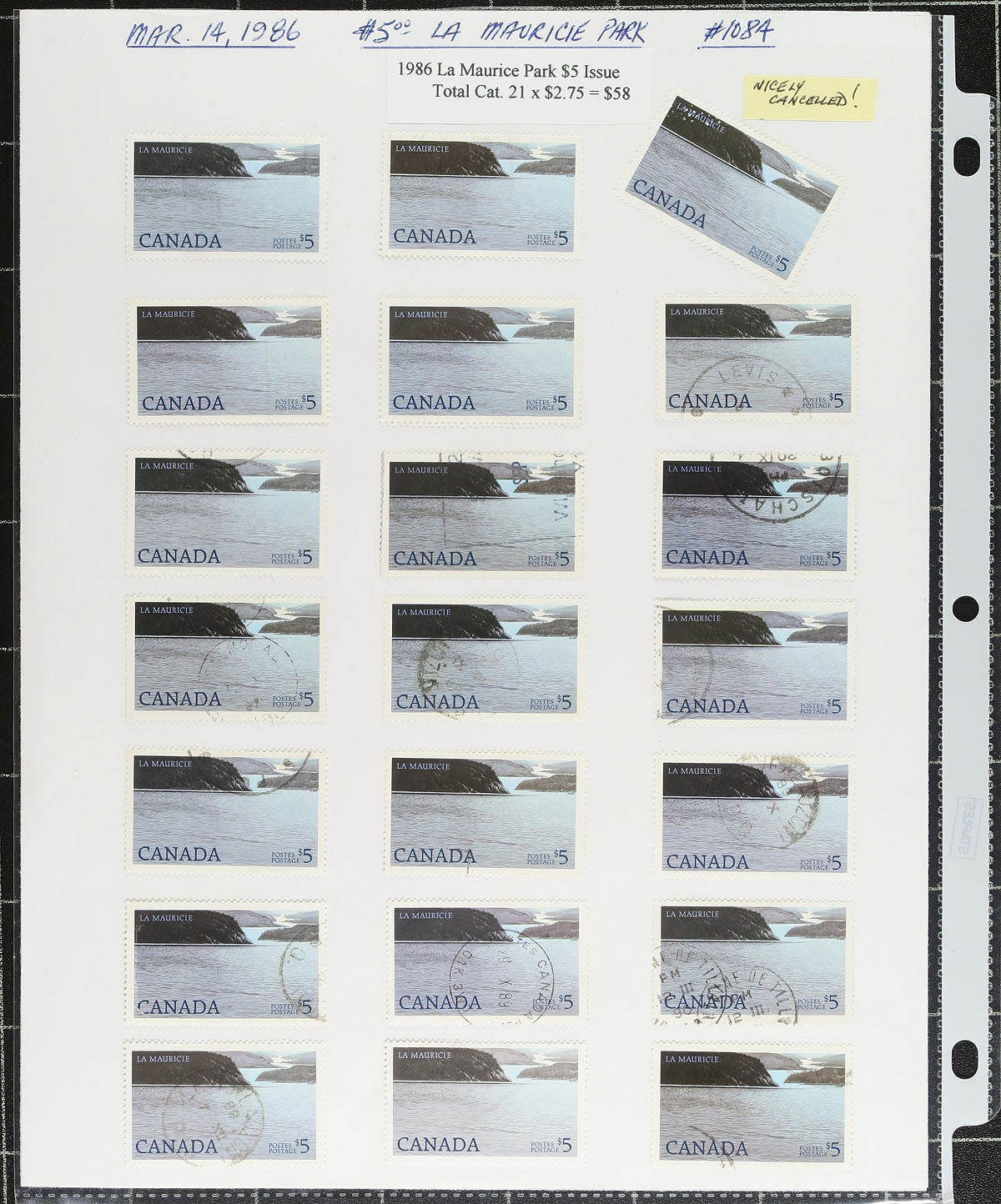 Stock of used Canada #1. Small Queens to the 1990's, containing well over 1,000 stamps in a variety of formats with roughly 70 album, stock, or manila pages. A spot check indicated low denomination Small Queens, Jubilees, Leafs up to Quebecs, with better representation from the Admirals to the 1940's (including a few sets), along with some modern material, varieties, etc. Postmark interest includes cds, duplex, split ring, a few squared circles, and more, noting many socked on the nose town cancels. Duplication up to 10 for some issues. A nice lot, with a potentially high catalogue value, for the used collector or postmark hunter. Estimate =