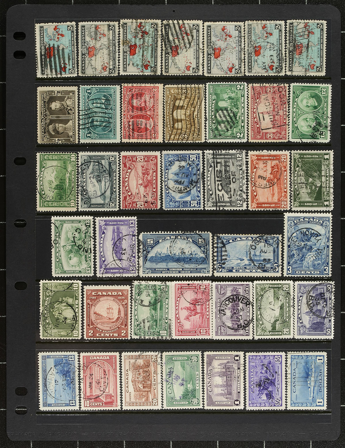 Stock of used Canada #1. Small Queens to the 1990's, containing well over 1,000 stamps in a variety of formats with roughly 70 album, stock, or manila pages. A spot check indicated low denomination Small Queens, Jubilees, Leafs up to Quebecs, with better representation from the Admirals to the 1940's (including a few sets), along with some modern material, varieties, etc. Postmark interest includes cds, duplex, split ring, a few squared circles, and more, noting many socked on the nose town cancels. Duplication up to 10 for some issues. A nice lot, with a potentially high catalogue value, for the used collector or postmark hunter. Estimate =