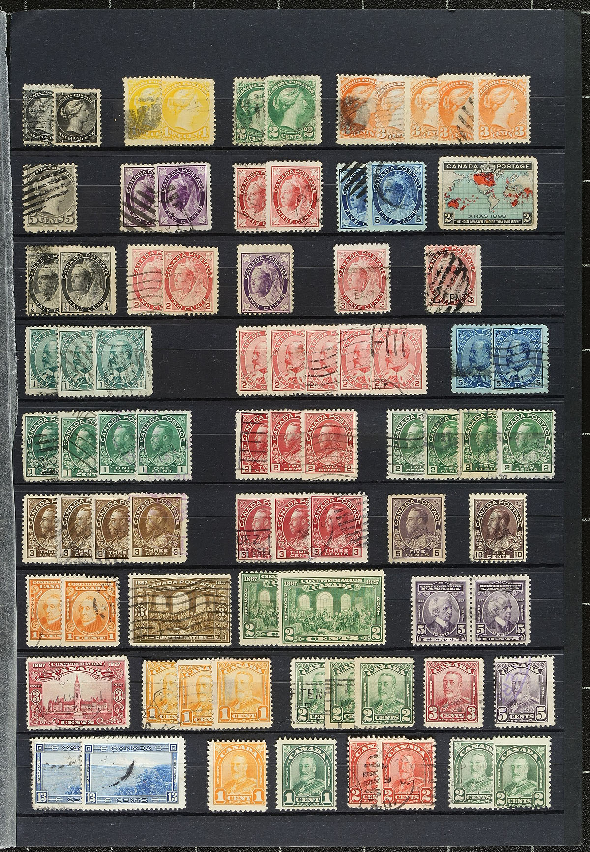 Stock of used Canada #2. Small Queens to the 1990s, containing well over 1,000 stamps in a variety of formats with roughly 70 album, stock, or manila pages. A spot check indicated low denomination Small Queens, Jubilees, sets and partial sets including Leafs up to Quebecs, with better representation from the Admirals to the 1940's, along with some modern material, varieties, etc. Postmark interest includes cds, duplex, split ring, a few squared circles, and more, noting many socked on the nose town cancels. Duplication up to 10 for some issues. A nice lot, with a potentially high catalogue value, for the used collector or postmark hunter. Estimate =