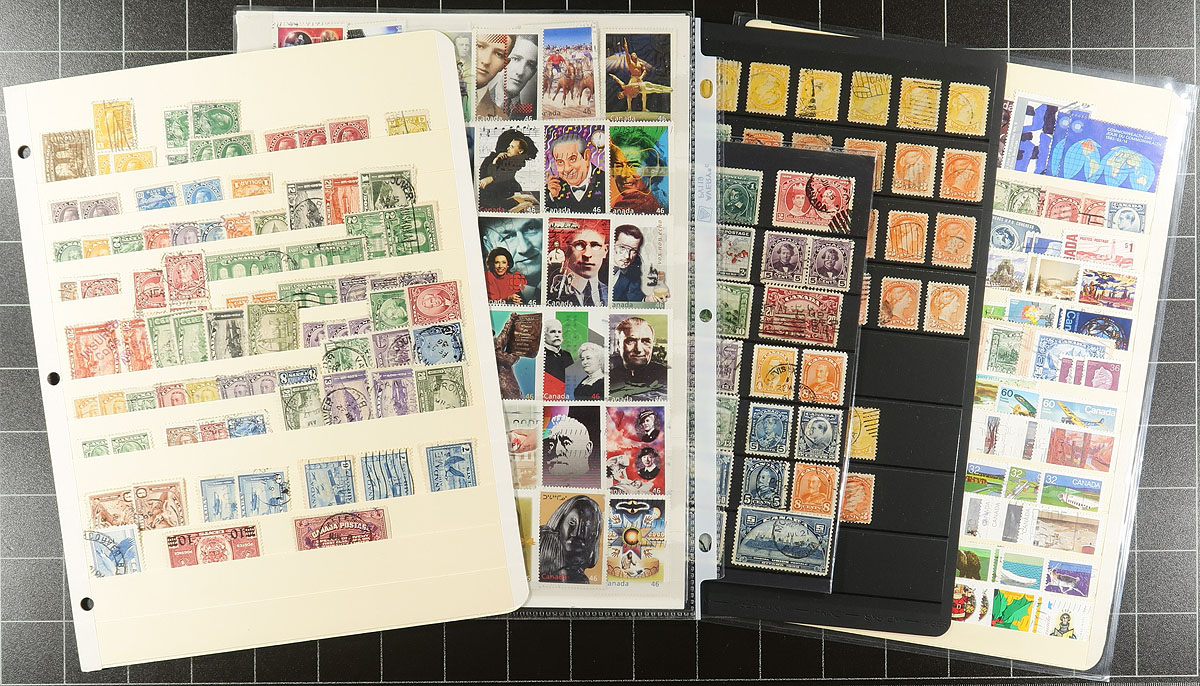 Stock of used Canada #2. Small Queens to the 1990s, containing well over 1,000 stamps in a variety of formats with roughly 70 album, stock, or manila pages. A spot check indicated low denomination Small Queens, Jubilees, sets and partial sets including Leafs up to Quebecs, with better representation from the Admirals to the 1940's, along with some modern material, varieties, etc. Postmark interest includes cds, duplex, split ring, a few squared circles, and more, noting many socked on the nose town cancels. Duplication up to 10 for some issues. A nice lot, with a potentially high catalogue value, for the used collector or postmark hunter. Estimate =