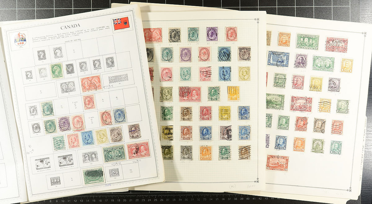Stock of used Canada #2. Small Queens to the 1990s, containing well over 1,000 stamps in a variety of formats with roughly 70 album, stock, or manila pages. A spot check indicated low denomination Small Queens, Jubilees, sets and partial sets including Leafs up to Quebecs, with better representation from the Admirals to the 1940's, along with some modern material, varieties, etc. Postmark interest includes cds, duplex, split ring, a few squared circles, and more, noting many socked on the nose town cancels. Duplication up to 10 for some issues. A nice lot, with a potentially high catalogue value, for the used collector or postmark hunter. Estimate =