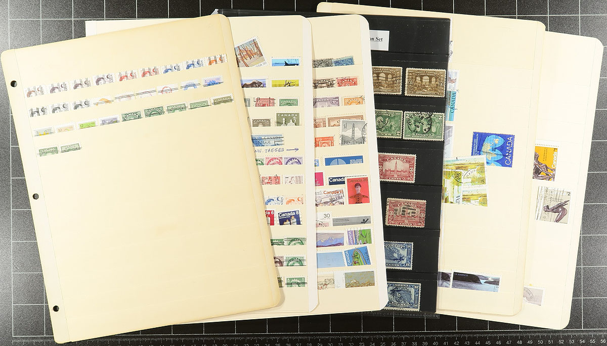 Stock of used Canada #2. Small Queens to the 1990s, containing well over 1,000 stamps in a variety of formats with roughly 70 album, stock, or manila pages. A spot check indicated low denomination Small Queens, Jubilees, sets and partial sets including Leafs up to Quebecs, with better representation from the Admirals to the 1940's, along with some modern material, varieties, etc. Postmark interest includes cds, duplex, split ring, a few squared circles, and more, noting many socked on the nose town cancels. Duplication up to 10 for some issues. A nice lot, with a potentially high catalogue value, for the used collector or postmark hunter. Estimate =