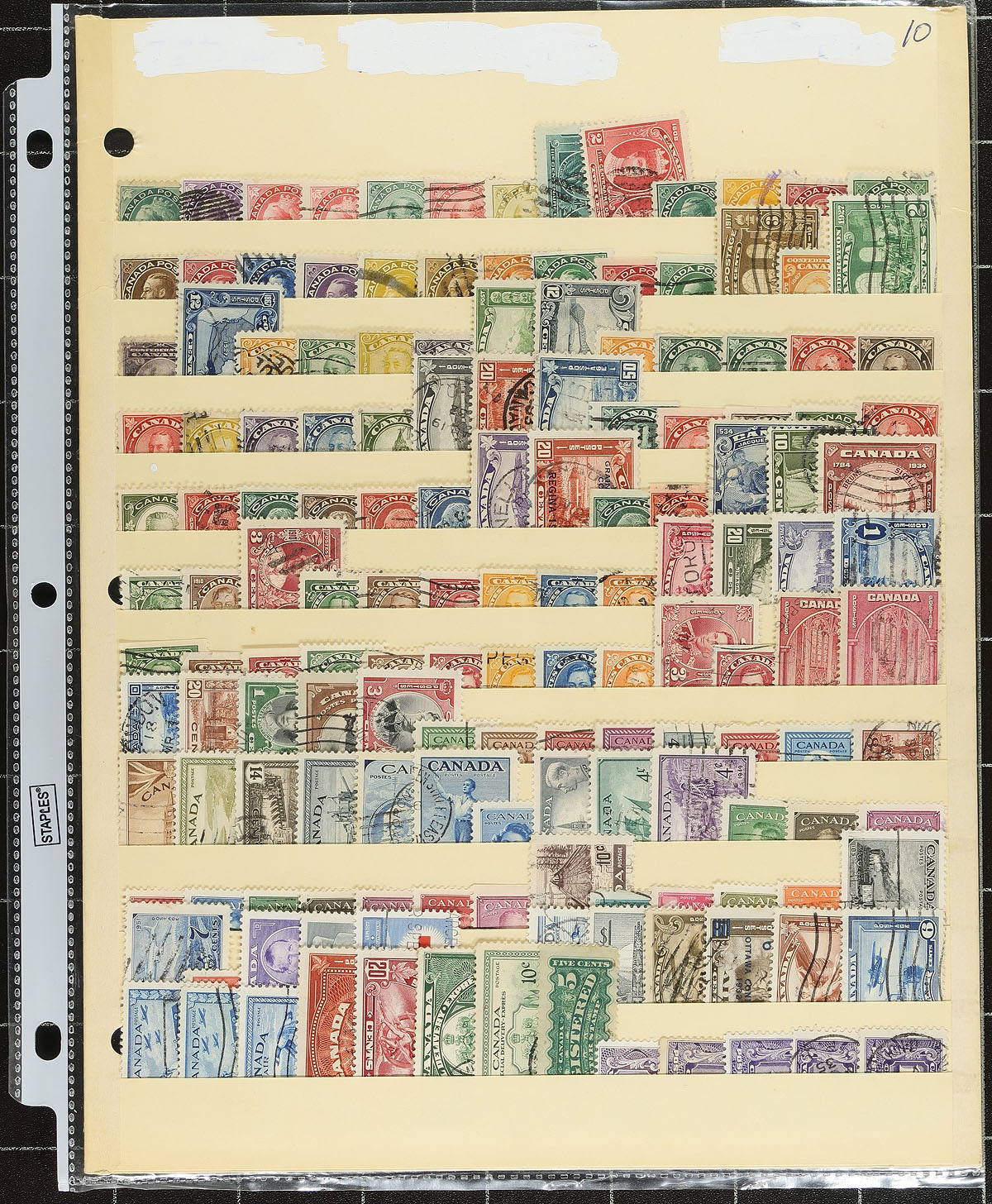 Stock of used Canada #2. Small Queens to the 1990s, containing well over 1,000 stamps in a variety of formats with roughly 70 album, stock, or manila pages. A spot check indicated low denomination Small Queens, Jubilees, sets and partial sets including Leafs up to Quebecs, with better representation from the Admirals to the 1940's, along with some modern material, varieties, etc. Postmark interest includes cds, duplex, split ring, a few squared circles, and more, noting many socked on the nose town cancels. Duplication up to 10 for some issues. A nice lot, with a potentially high catalogue value, for the used collector or postmark hunter. Estimate =