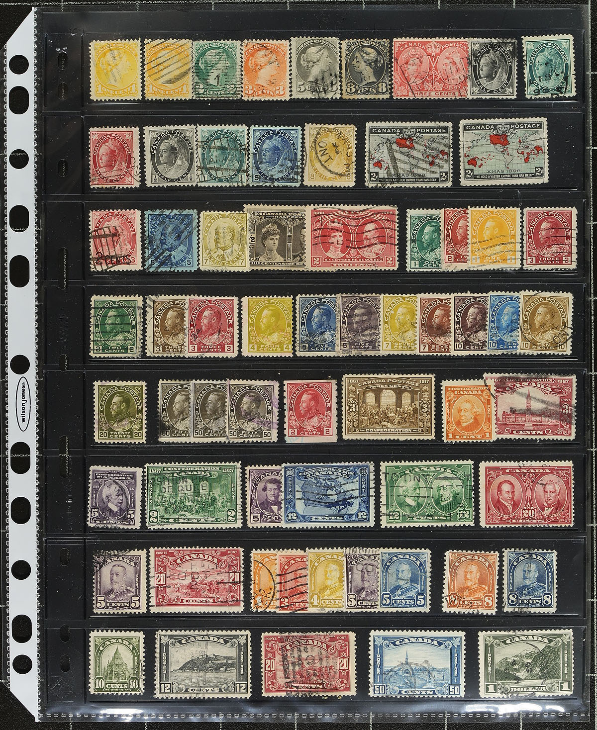 Stock of used Canada #2. Small Queens to the 1990s, containing well over 1,000 stamps in a variety of formats with roughly 70 album, stock, or manila pages. A spot check indicated low denomination Small Queens, Jubilees, sets and partial sets including Leafs up to Quebecs, with better representation from the Admirals to the 1940's, along with some modern material, varieties, etc. Postmark interest includes cds, duplex, split ring, a few squared circles, and more, noting many socked on the nose town cancels. Duplication up to 10 for some issues. A nice lot, with a potentially high catalogue value, for the used collector or postmark hunter. Estimate =