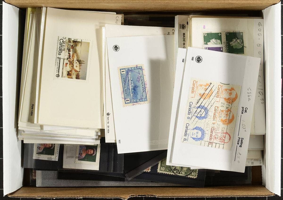 Accumulation of used Canada, 1870's to modern, containing many hundreds of stamps in several stock cards and dealer 102 cards. A spot check indicated Small Queens, Jubilees (noting 50c), partial and complete sets of Leafs, Numeral, Edwards, Quebecs on up, including the 50c Bluenose (x5), modern issues (including a few varieties), and more. Postmark interest includes cds, duplex, squared circles, and more, including socked on the nose town cancels. Duplication up to 10 for a few issues. A nice lot with a potentially high catalogue value, for the used collector or postmark hunter. Estimate =