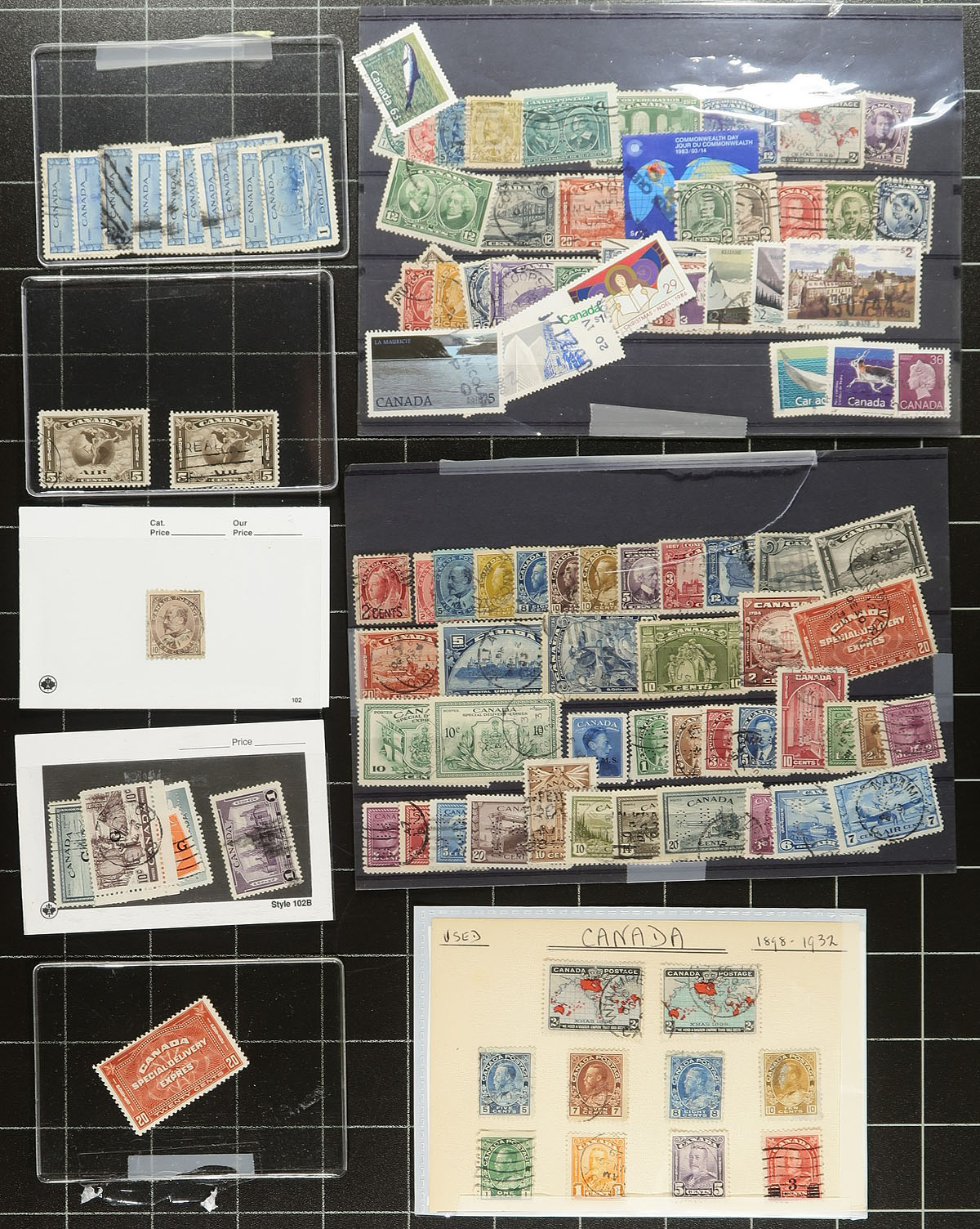 Accumulation of used Canada, 1870's to modern, containing many hundreds of stamps in several stock cards and dealer 102 cards. A spot check indicated Small Queens, Jubilees (noting 50c), partial and complete sets of Leafs, Numeral, Edwards, Quebecs on up, including the 50c Bluenose (x5), modern issues (including a few varieties), and more. Postmark interest includes cds, duplex, squared circles, and more, including socked on the nose town cancels. Duplication up to 10 for a few issues. A nice lot with a potentially high catalogue value, for the used collector or postmark hunter. Estimate =